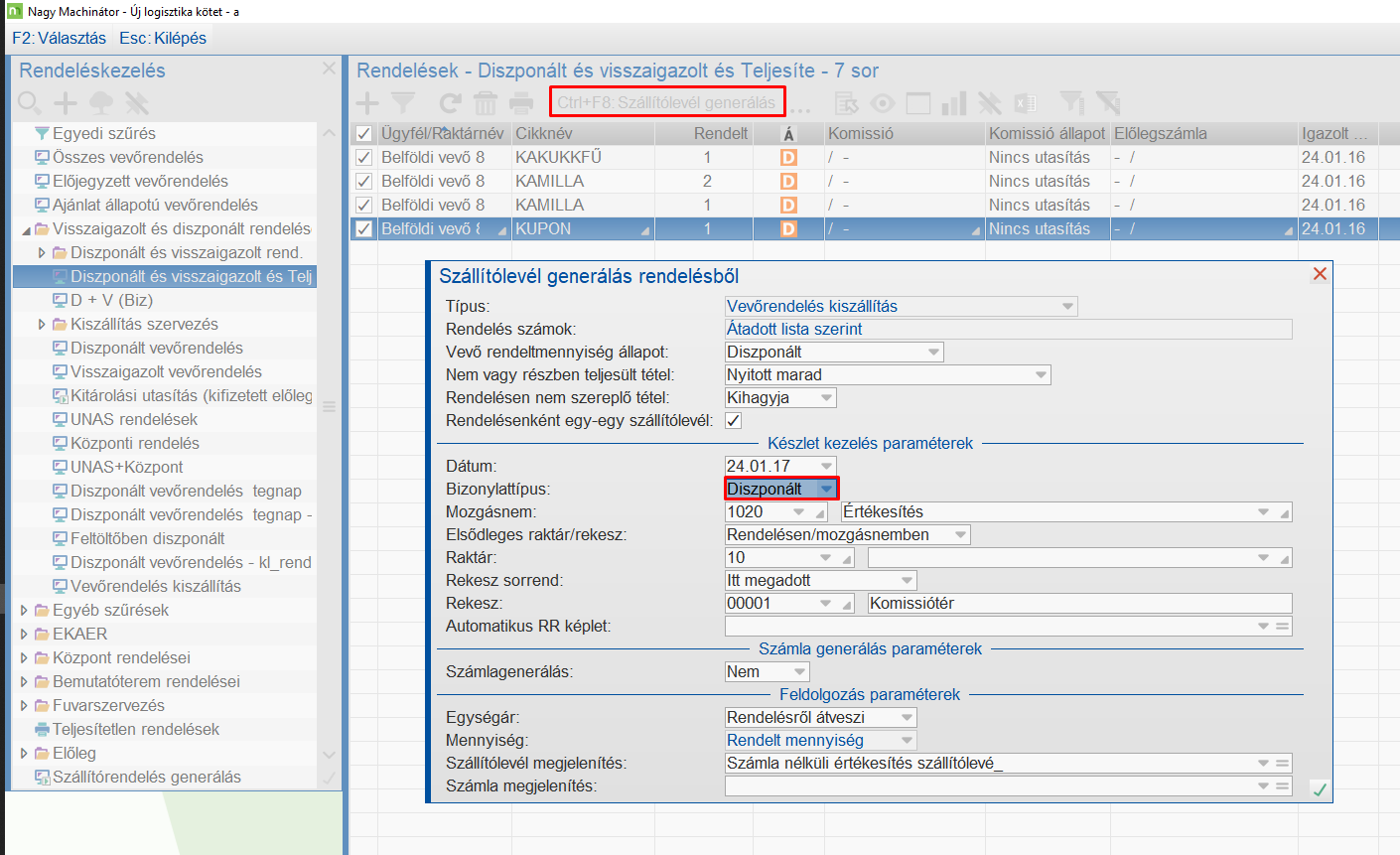 A Vevőrendelések alapján Diszponált állapotú szállítóleveleket generál a program.