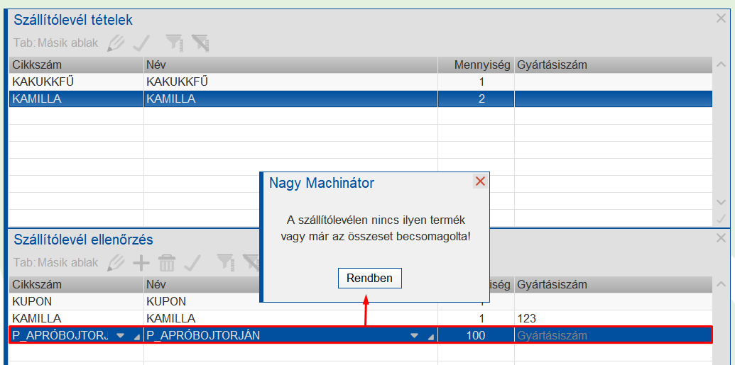 A csomagoló leolvassa a felső ablakban a dobozba rakandó termék nevét.