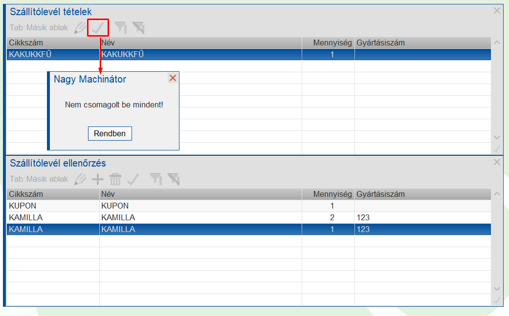 Csomagolás - Szállítólevél ellenőrzés funkcióval [KL_SZELL Param:SzEllÜzemmód:Csomagolás] |