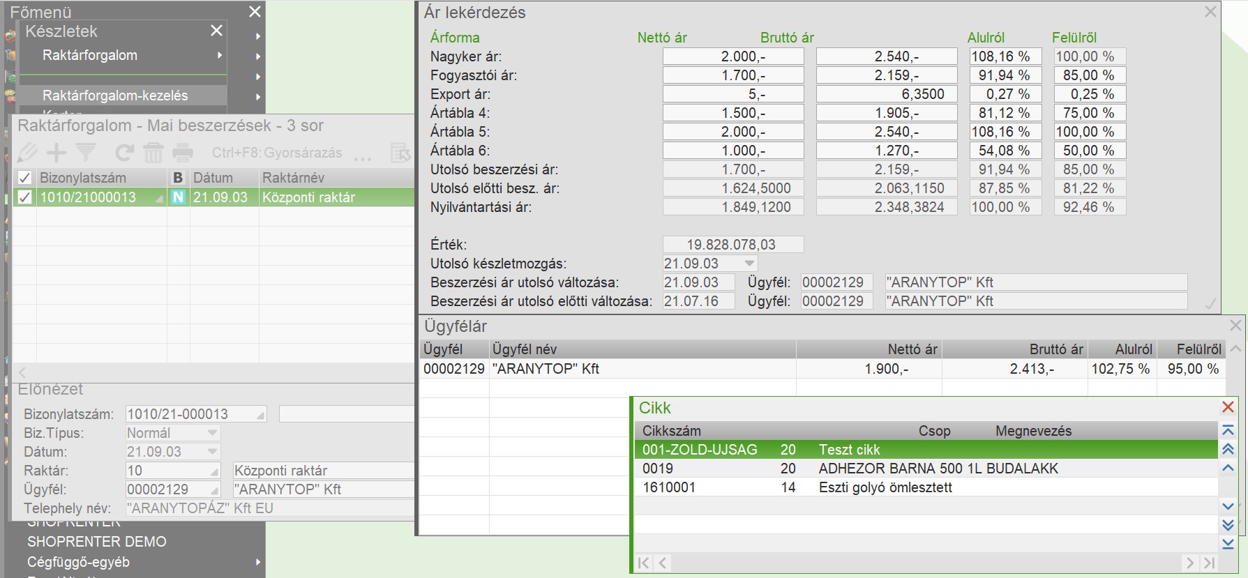 Ha az ÜgyfélSzűrés paramétert is megadjuk (kötelezően értékkel), akkor a műveletben megjelennek az ügyfélárak is.