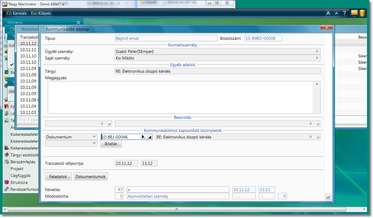 A Tranzakció dátumába az email beérkezésének időpontja, míg a felvétel dátumába a bejelentkezés dátuma kerül. A Kommunikációs adatlapról rögtön meg lehet tekinteni az emailt eredeti formájában.