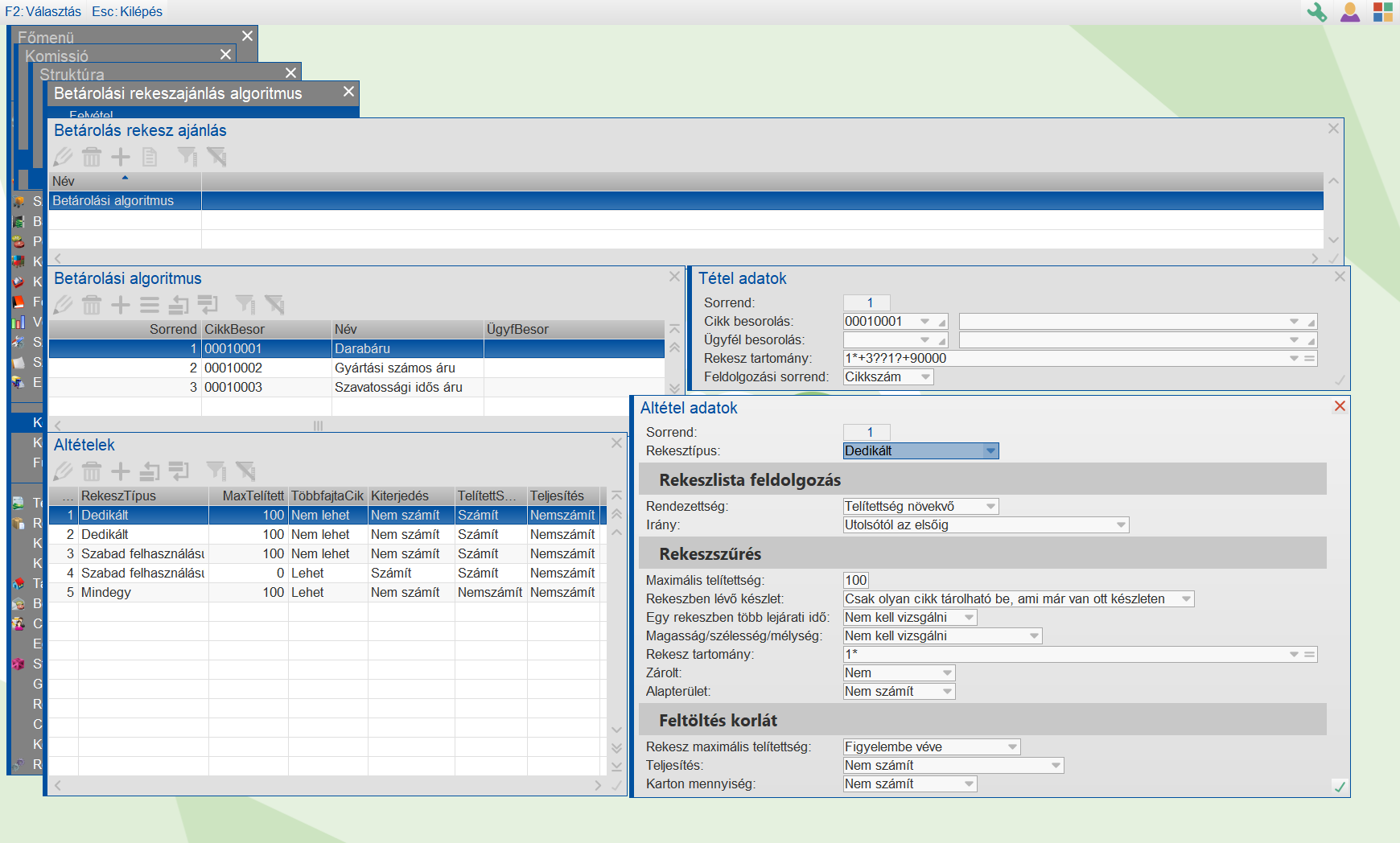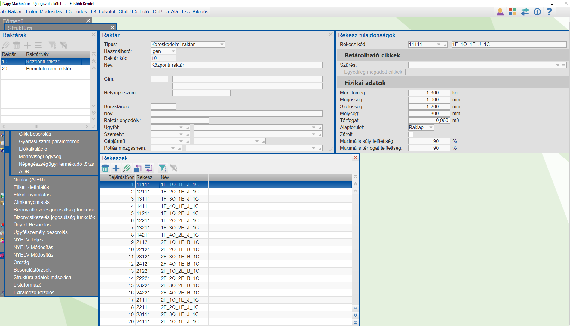 A programban a raktár-irányítási folyamatok támogatására egy szabadon definiálható raktárstruktúrát lehet leképezni.