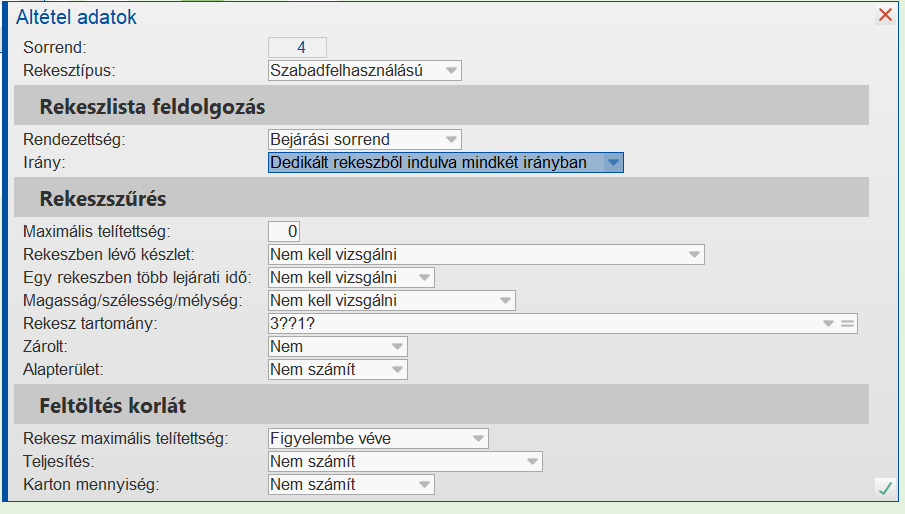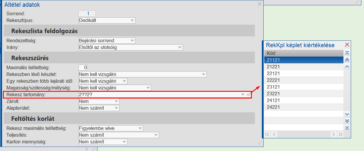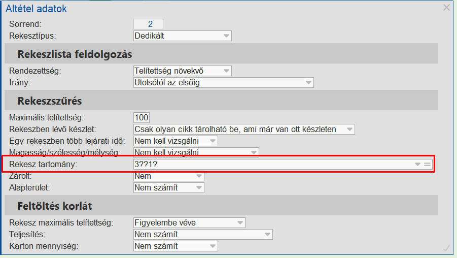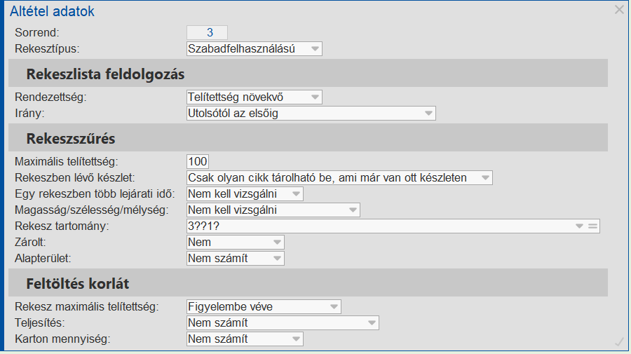 Amennyiben az algoritmus ezt az értéket ajánlotta érdemes átvizsgálni a paraméterezést, hogy miért nem tudta azt a rekeszt ajánlani a program, ahova végül is fizikailag be lehetett tárolni az árut.
