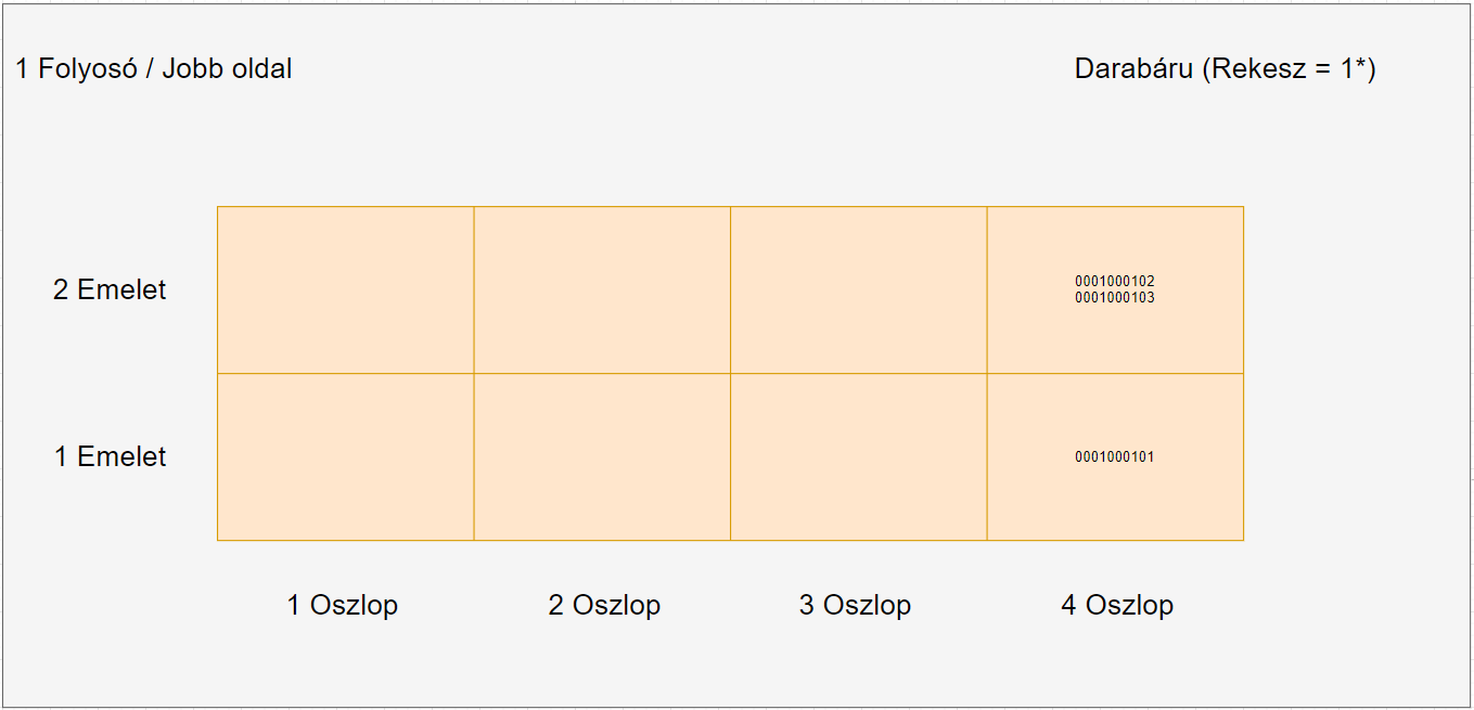 Az alábbi példán az látszik, hogy az 1 Folyosó Jobb oldalán 4 oszlop 1 emelet 1 cellába a 0001000101 cikkszámot lehet betárolni.