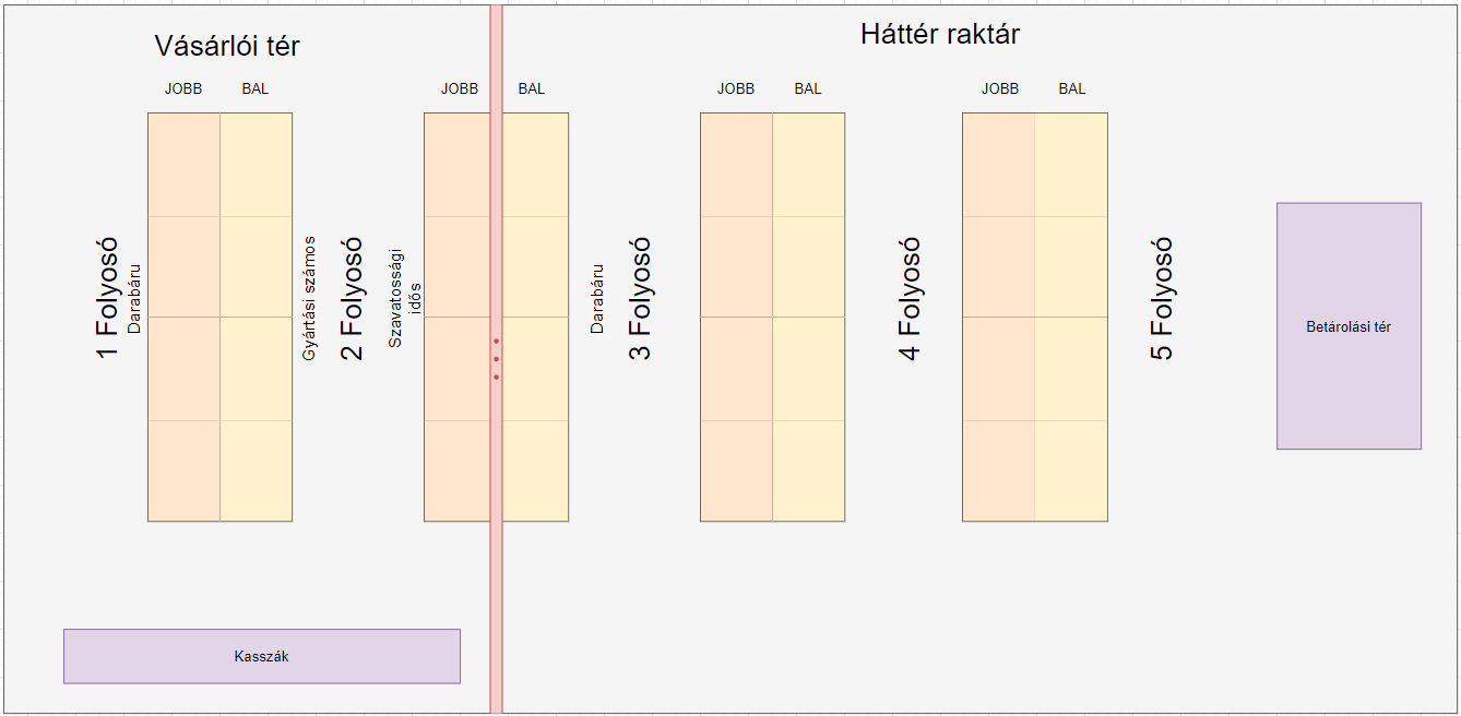 Az egyes folyosókban csak egy árucsoport található, amelyet kizárólag az árucsoporthoz dedikált raktári dolgozó tölt fel.