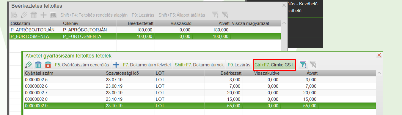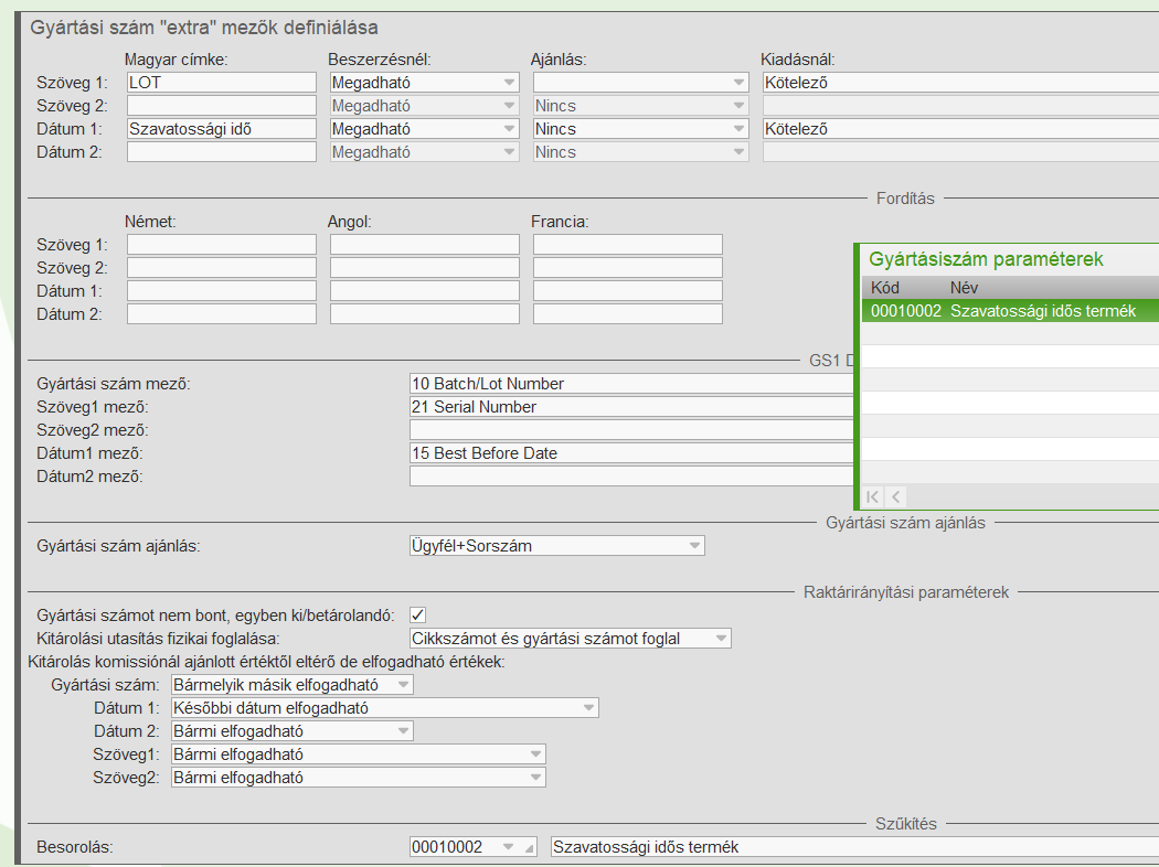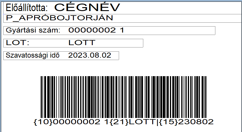 A kinyomtatott kódba bele kell tenni, mert ez alapján történik , az EAN kód mellett az egyértelmű azonosítás. A GS1-ben a 10-es kódot, azaz Batch/Lot számot fogja tartalmazni. Ennek hossza viszont nem lehet hosszabb 20 karakternél, ezért olyan érték ajánlási algoritmust kell választani, ami a várható értéket bent tartja 20 karakter alatt: Ennek a feltételnek az Ügyfél + Sorszám érték felel meg. |