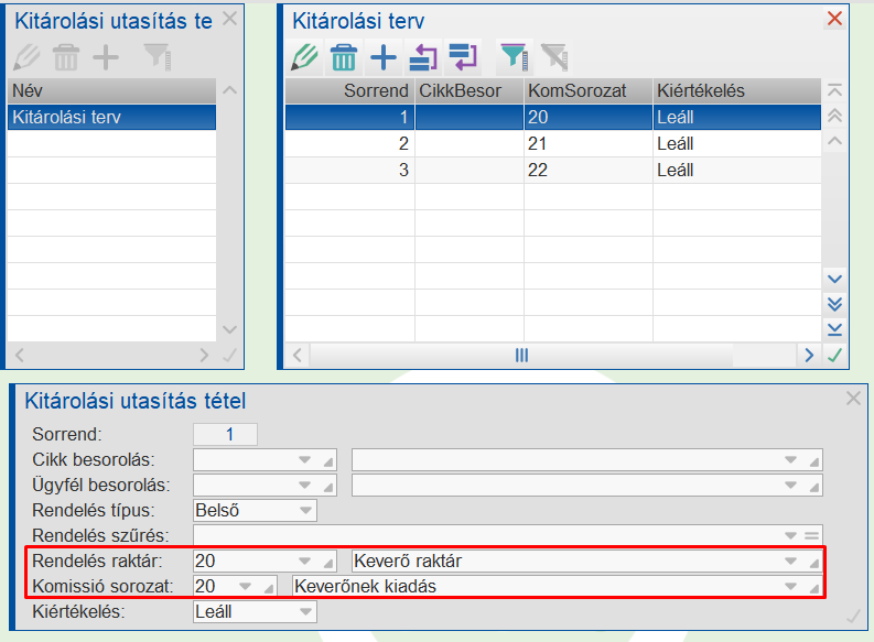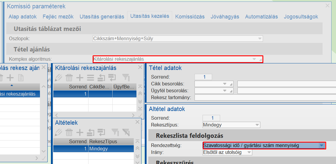 Miután az áttárolási utasítást legenerálta a program, a kitárolási rekeszajánlás paraméterek alapján megkeresi a legkorábbi szavatosságú zsákok közül a legkisebb zsákokat, és azokkal igyekszik teljesíteni az igényt.