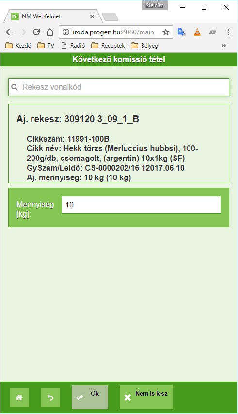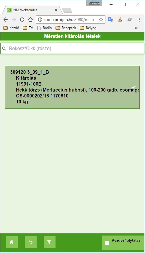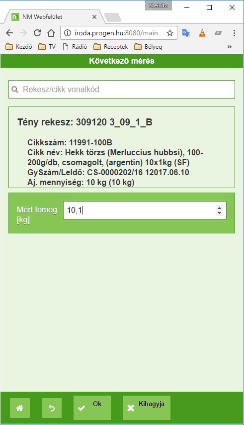 Mérés végrehajtásaA Kitárolás során először a raktárhelyek szerint kiszedik az árut a Komissiótérbe, majd a Lerakodó hely (Város / kerület) alapján szétválogatják raklapokra. A kiszedéssel párhuzamosan, a komissiótérbe kiszedett árut lehetőség van lemérni. Az áru mérésére általában egalizált mennyiségű áru esetén szükséges. A kitárolás mérése menüpontot kell kiválasztani. A menüpont kiválasztása után megjelennek azok az utasítások, amelyeken van már mérhető áru. Megjelennek azok a termékek, amelyeket már kiszedett a kiszedő és le lehet mérni. A termék kiválasztása után a mért adat bevitele. A mérés végén megjelenő képernyő. |