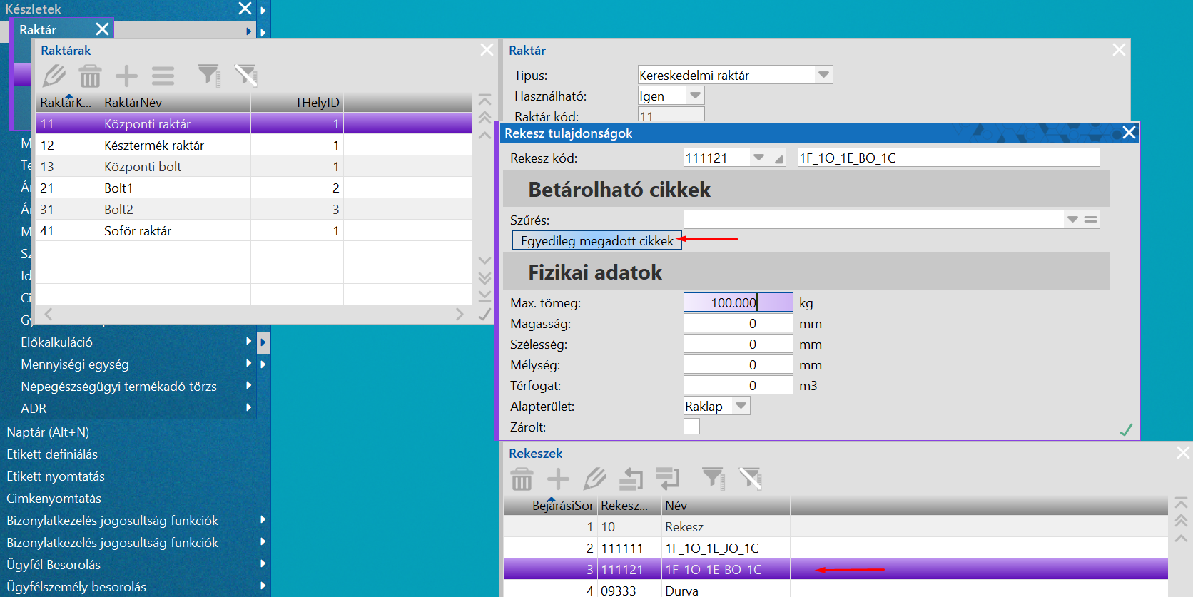 Ide kell felvenni, hogy melyik terméket lehet betárolni a rekeszbe és abból minimálisan mennyi lehet benne.