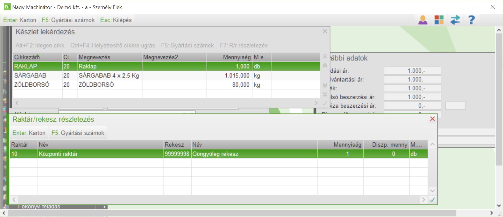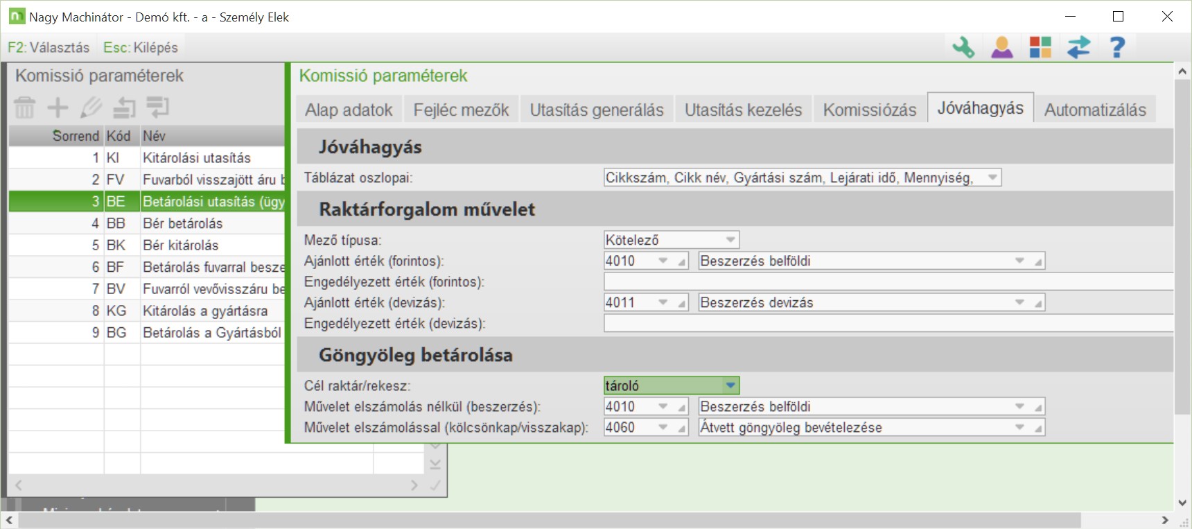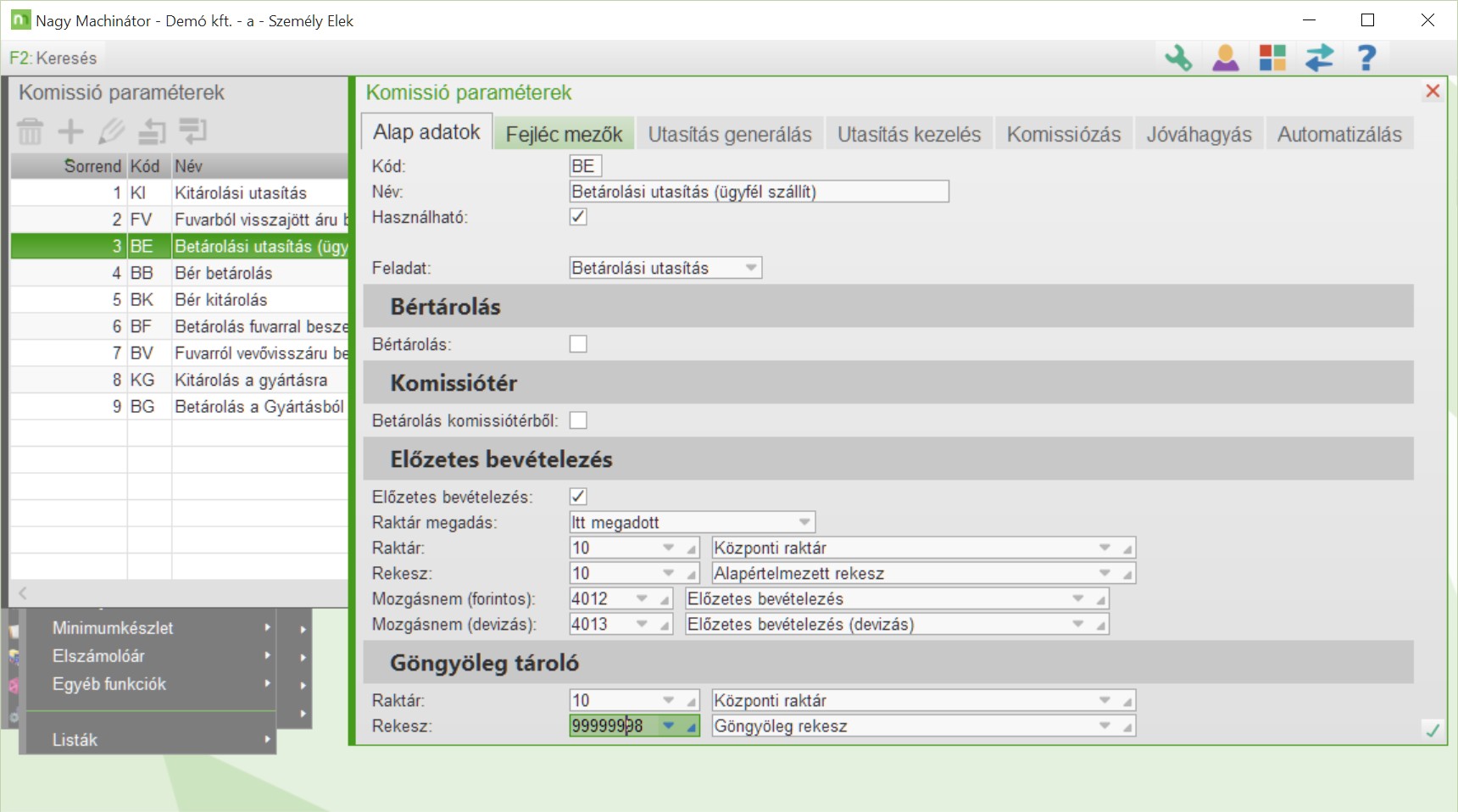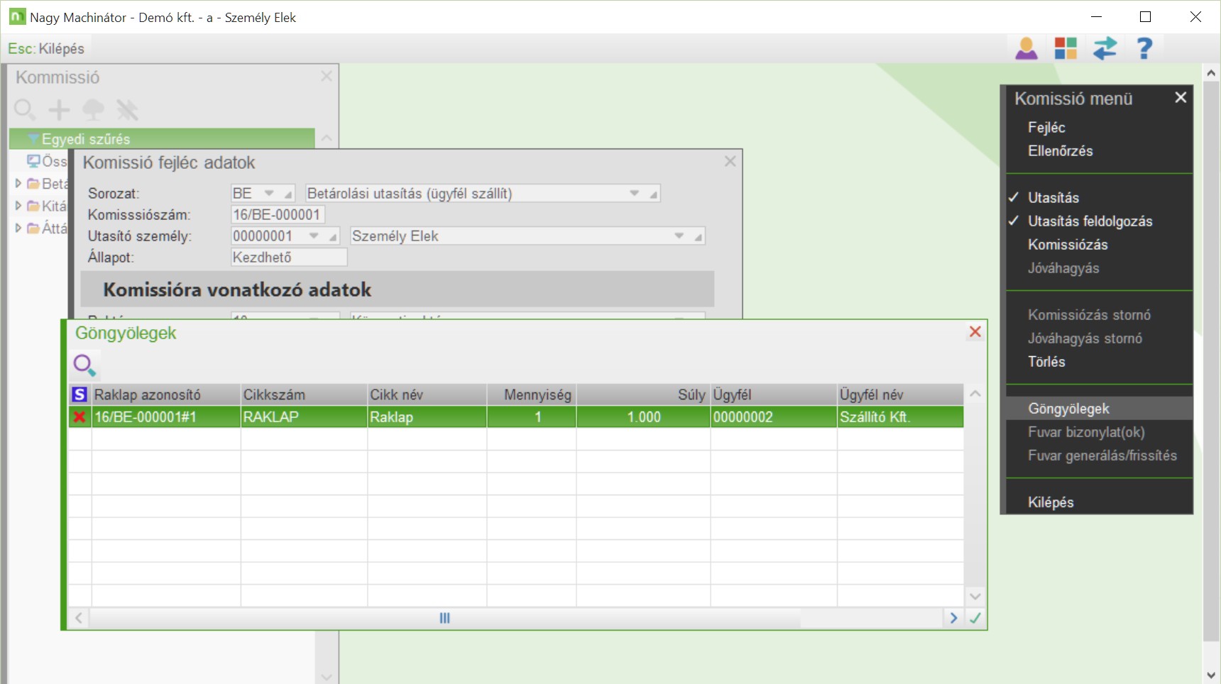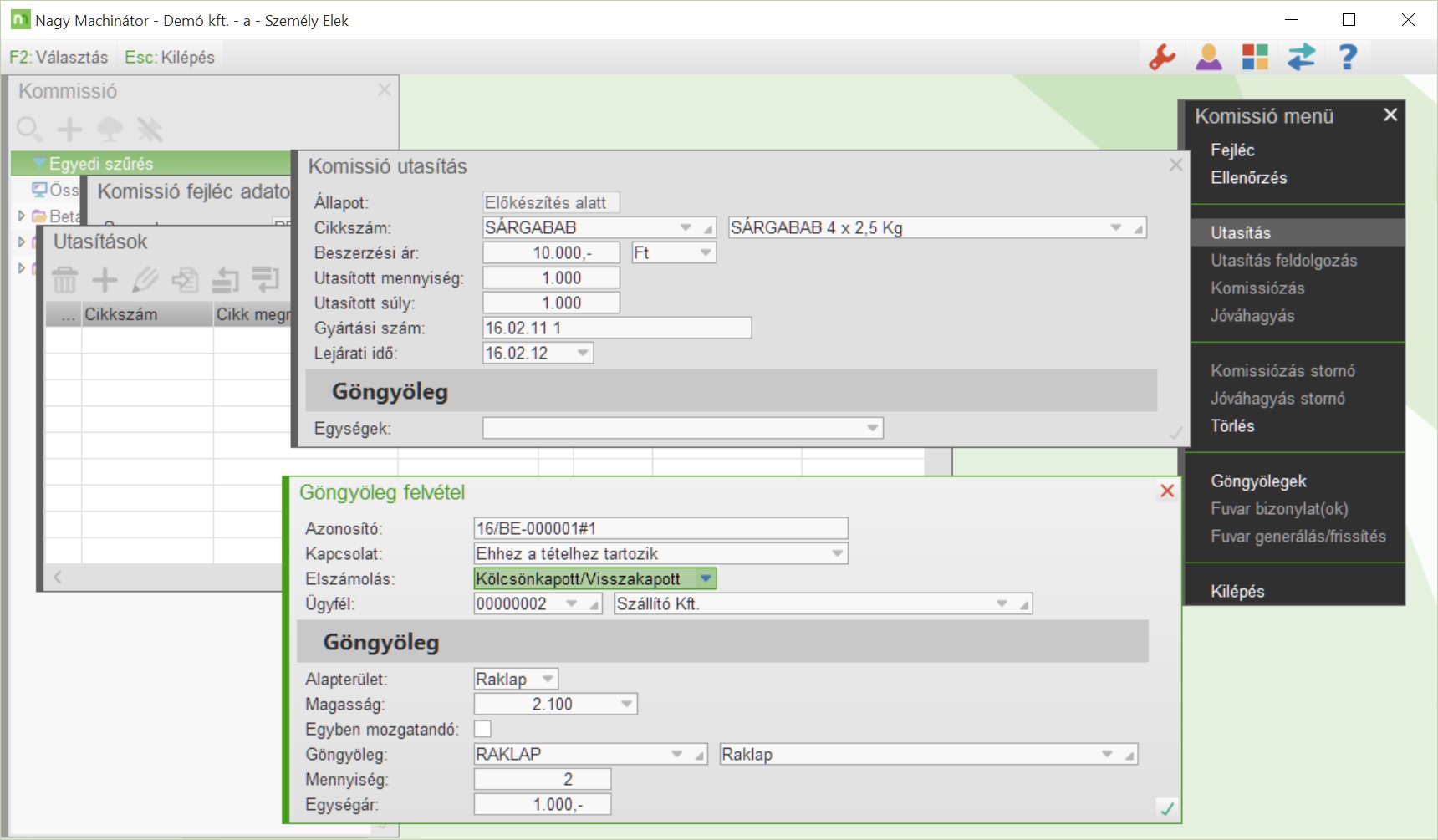 BetárolásBetárolás esetén az utasításhoz megadott göngyölegről tudjuk megmondani, hogy kölcsönkaptuk vagy visszakaptuk, ami eddig kölcsönben volt, vagy esetleg beszerzésként kell kezelni a göngyöleget. A Göngyölegek almenüpontban lehet megtekinteni az összes göngyöleget, amit a komissióval kezelnek. A komissió jóváhagyása után a göngyöleg bekerül automatikusan a göngyöleg rekeszbe. |
