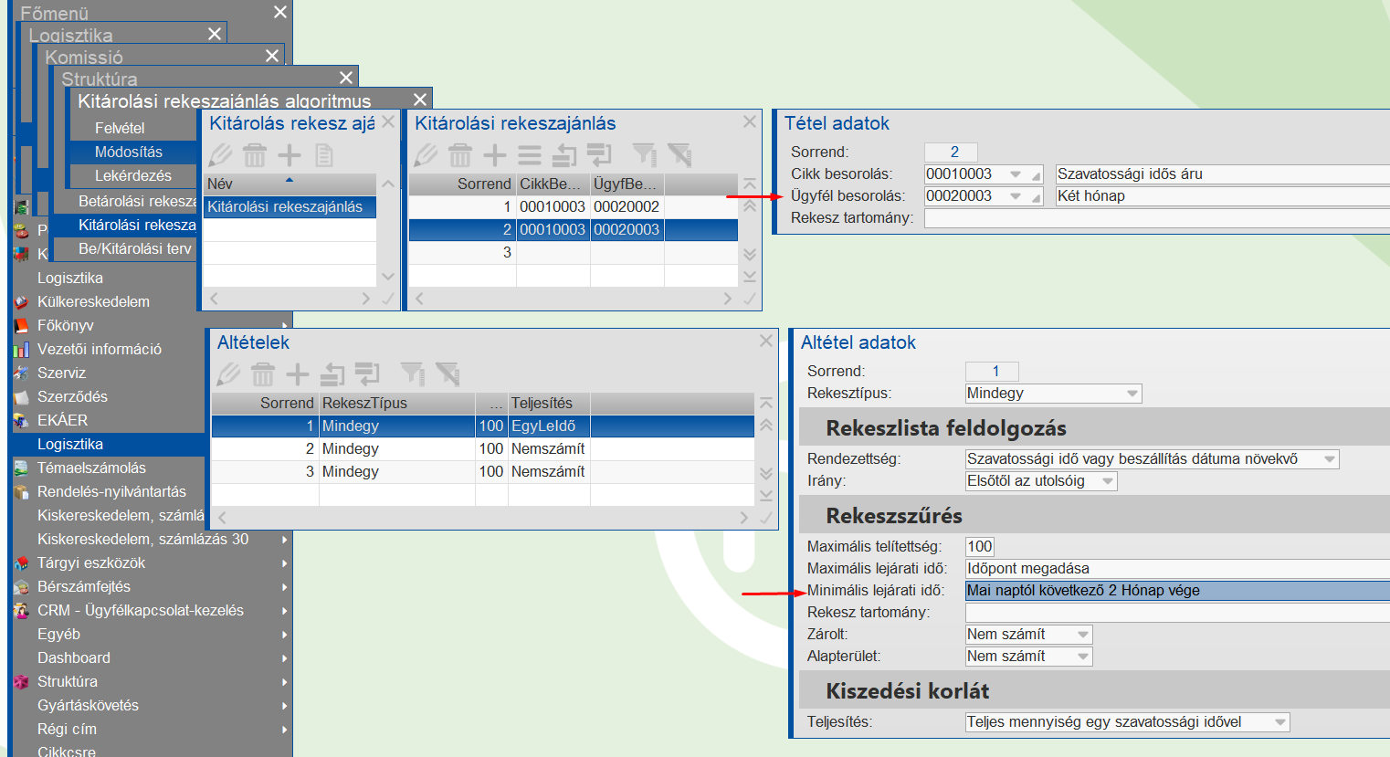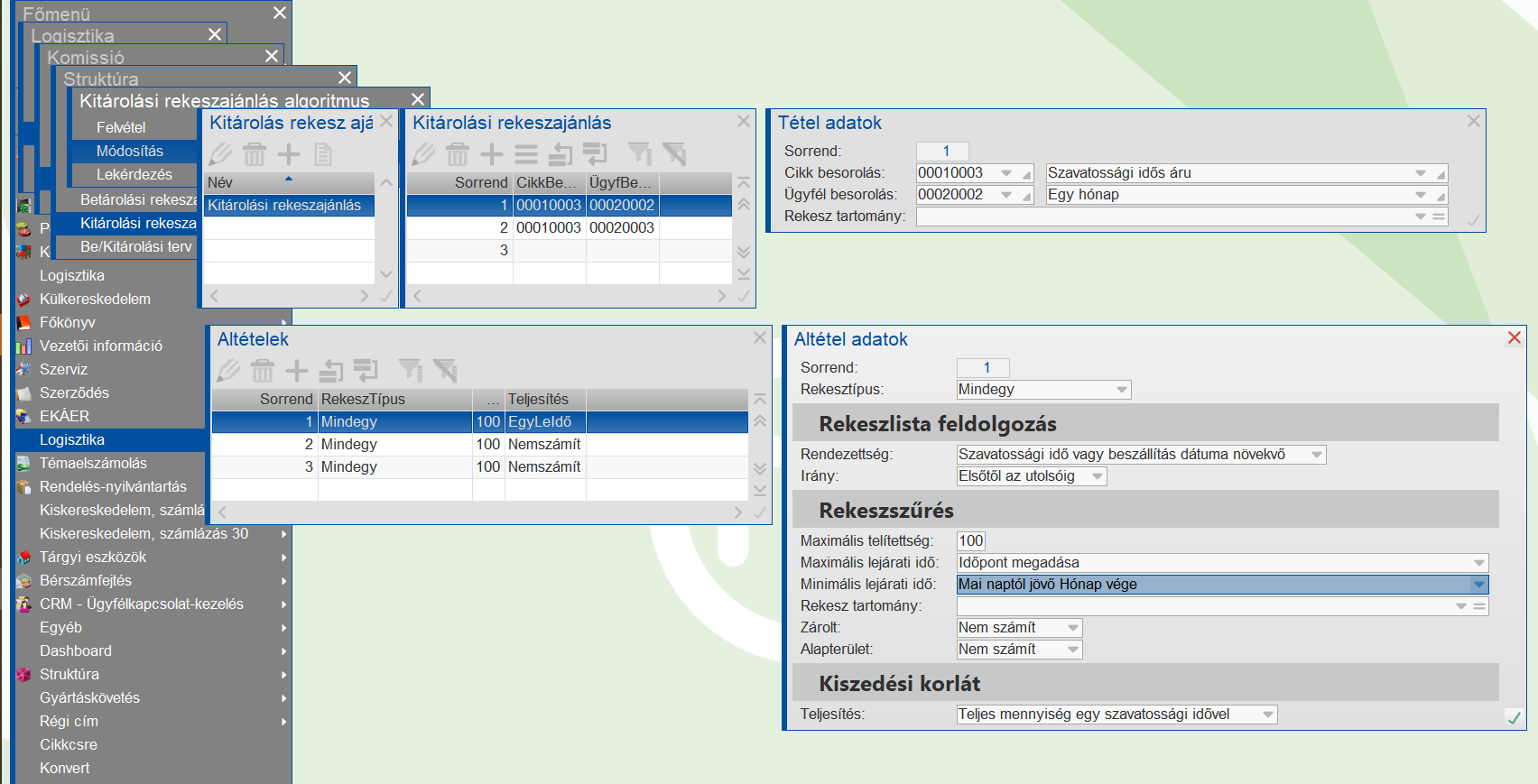 Ebben az esetben már nem teljesíthető, hogy egy szavatossági időből kiadható legyen a 11 darab, hiszen az egy hónapnál tovább lejáró szavatossági időkből max. 10 darab van, ezért a program áttér a második kiértékelési algoritmusra, amely már megengedi, hogy vegyes szavatossági idő legyen.