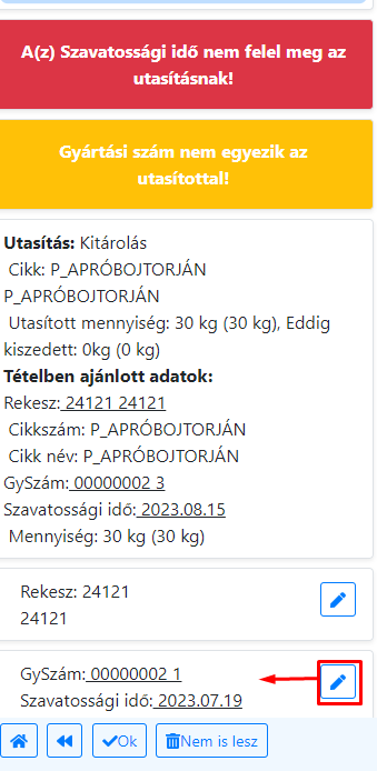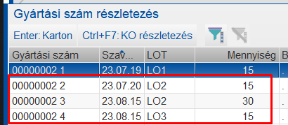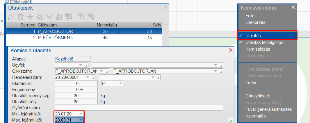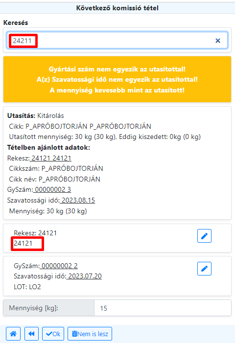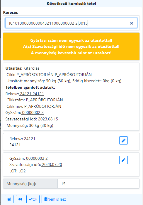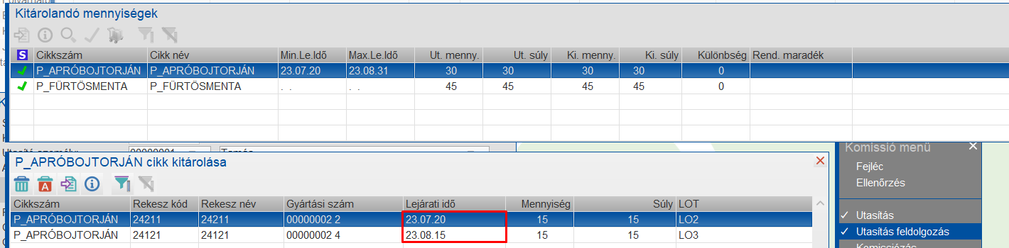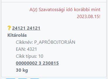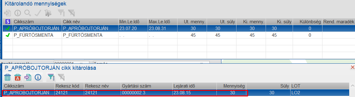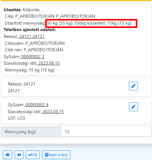 Az ajánlott értéktől manuálisan el lehet térni. Jelen esetben a raktárvezető úgy döntött, hogy nem két lejárati idővel fogja kiszolgálni a vevőt, hanem egy 30 kg-os gyártási számot választott helyette.