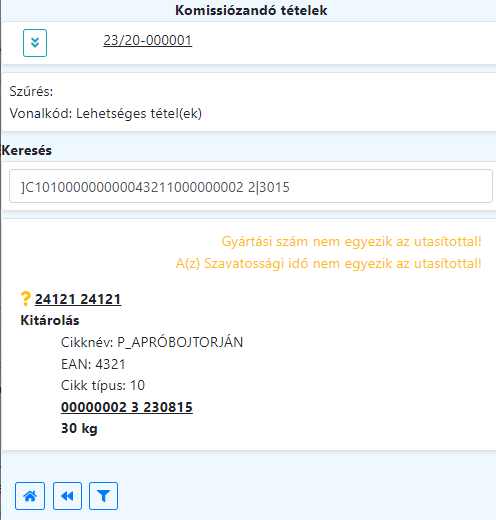Miután a komissiózó a tétel listában lehúzza a GS1 kódot, a program az EAN alapján megnézi, hogy melyik utasítástételhez lehet elfogadni azt. Majd az egyes beállított tulajdonságokat is ellenőrzi. Amennyiben nem megfelelő a kód egyik tételhez sem, mindegyik tételhez megmondja, hogy miért nem lehet elfogadni.