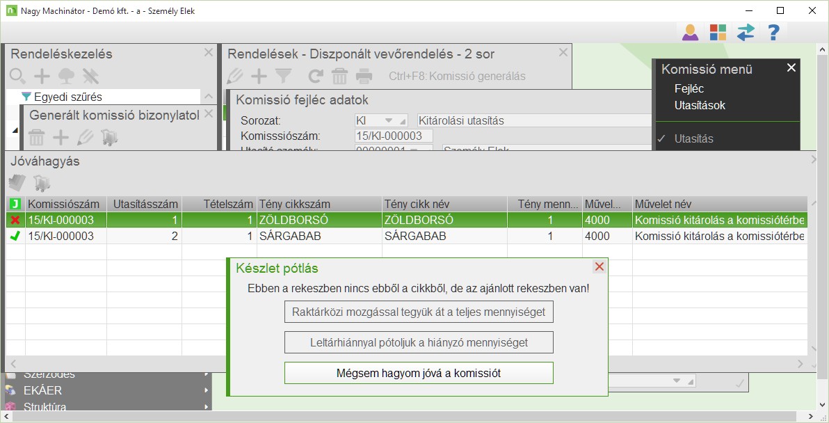 Negatív készlet elkerüléseA jóváhagyás műveletnek akkor van jelentősége, ha a komissiózás során más rekeszből vették ki az árut, mint ahová az utasítás feldolgozás küldte a raktári dolgozót. Ebben az esetben nagy valószínűséggel a ténylegesen használt rekeszben nem lesz áru. A program viszont megpróbálja elkerülni a negatív készletet azzal, hogy még s kitárolás esetén átrendezi a készletet abba a rekeszbe, ahonnan valójában kivették az árut.