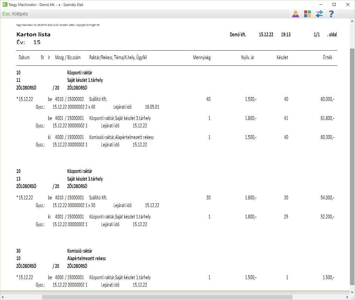 Az alábbi képen látható az eredmény: A program nem talál a 11-es rekeszben 15.12.22. lejárati dátummal zöldborsót, ezért először a 13-as rekeszből áttárolja (a 4001-es mozgással), majd utána helyezi ki a Komissiótérbe.