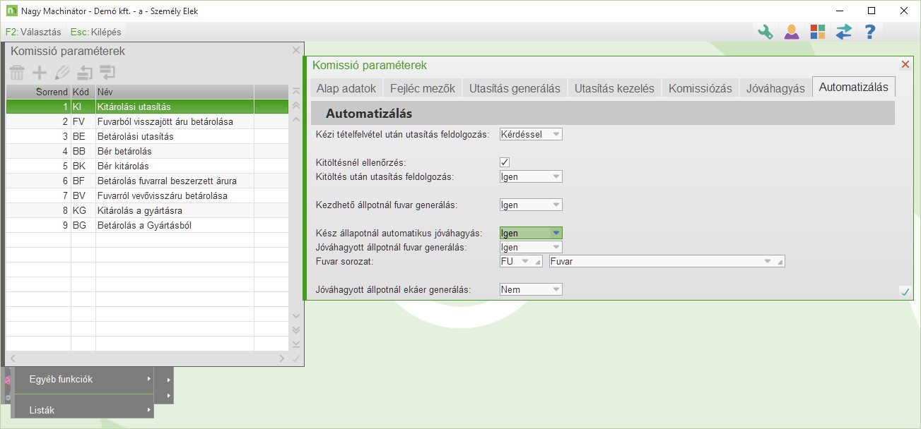 JóváhagyásA jóváhagyás a komissió művelet lezárása. A jóváhagyás során a termék a készletnyilvántartásban egy raktárközi bizonylattal a raktárból kikerül a komissiótérbe. A jóváhagyás történhet automatikusan is, abban az esetben ha kontrollra nincs szükség.