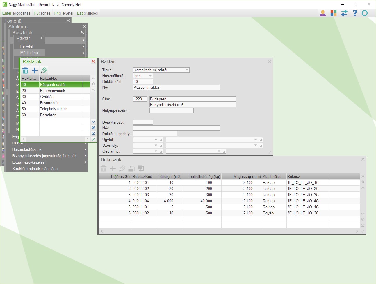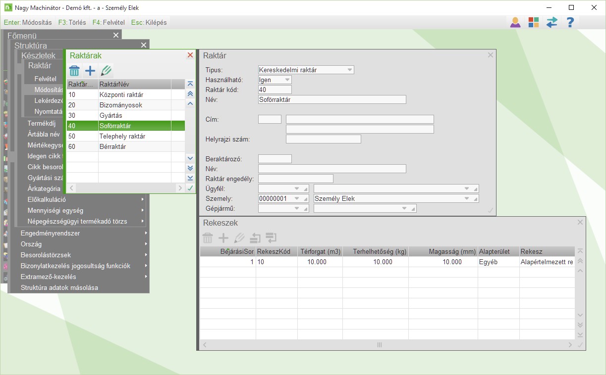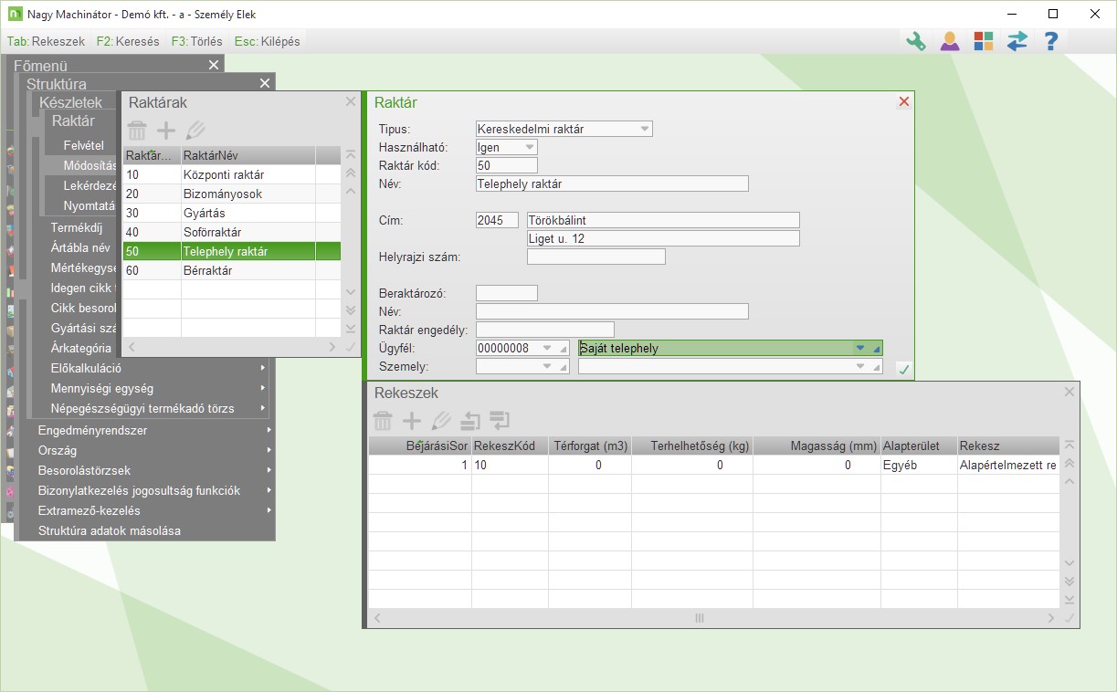 Rekesz (Tárhely)Amennyiben a raktárnak hagyományos felépítése van a rekeszstruktúrát a következők szerint érdemes kialakítani. A rekesznevébe kell bekódolni a rekesz fizikai helyét a raktárba. A következő szegmensekre utaló értékeket kell egymás után felsorolni a szövegben Folyosó, Oszlop, Emelet, Oldal (jobb/bal), Cella Az egyes szegmenseket "_" jellel kell elválasztani egymástól. Ez azt is jelenti, hogy bármit be lehet írni az egyes szegmensbe, a lényeg, hogy "_" legyen az elválasztó karakter. Pl.: 1_1_1_J_1: az jelenti, hogy 1.folyosó, első oszlop, első emelet, jobb oldal, első cella de azt is írhatjuk, hogy 1F_1O_1E_JO_1C. A lényeg, hogy egységes legyen a definíció. A rekeszkódnak nagy jelentősége van. Az egyes paraméterezések során rekeszképlet megadásával, ez alapján lehet majd a raktár fizikai részekre osztani. A szegmensek megadásának a rekesz-lekérdezés funkcióban lesz jelentősége.