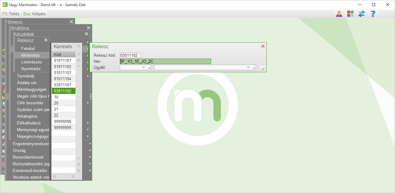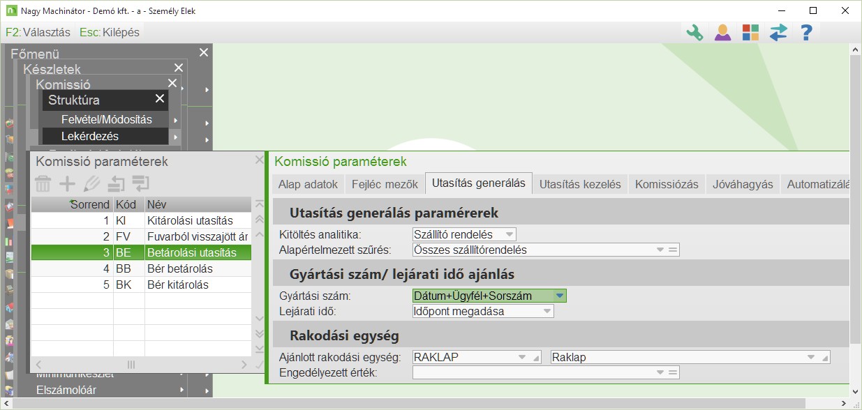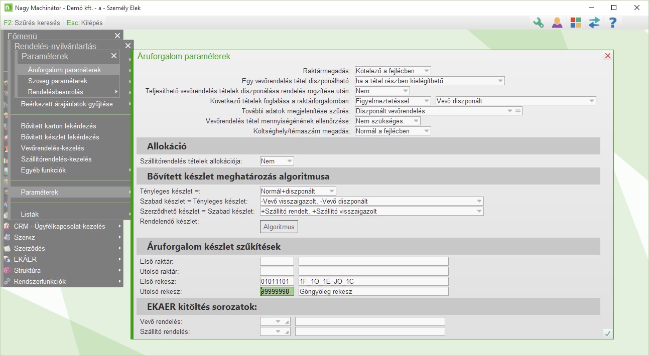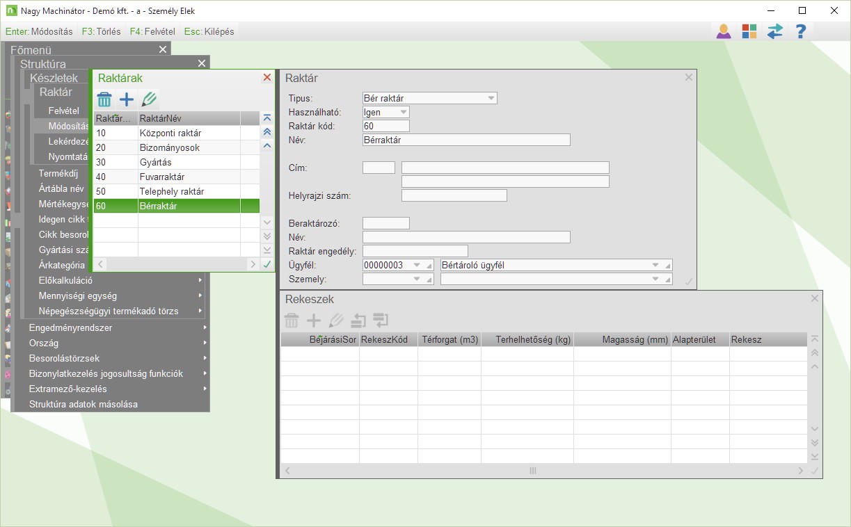 Rekesz (Tárhely)Amennyiben a raktárnak hagyományos felépítése van a rekeszstruktúrát a következők szerint érdemes kialakítani. A rekesznevébe kell bekódolni a rekesz fizikai helyét a raktárba. A következő szegmensekre utaló értékeket kell egymás után felsorolni a szövegben Folyosó, Oszlop, Emelet, Oldal (jobb/bal), Cella Az egyes szegmenseket "_" jellel kell elválasztani egymástól. Ez azt is jelenti, hogy bármit be lehet írni az egyes szegmensbe, a lényeg, hogy "_" legyen az elválasztó karakter. Pl.: 1_1_1_J_1: az jelenti, hogy 1.folyosó, első oszlop, első emelet, jobb oldal, első cella de azt is írhatjuk, hogy 1F_1O_1E_JO_1C. A lényeg, hogy egységes legyen a definíció. A rekeszkódnak nagy jelentősége van. Az egyes paraméterezések során rekeszképlet megadásával, ez alapján lehet majd a raktár fizikai részekre osztani. A szegmensek megadásának a rekesz-lekérdezés funkcióban lesz jelentősége.