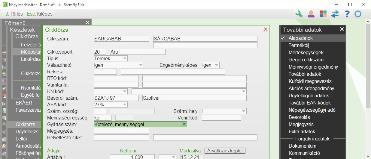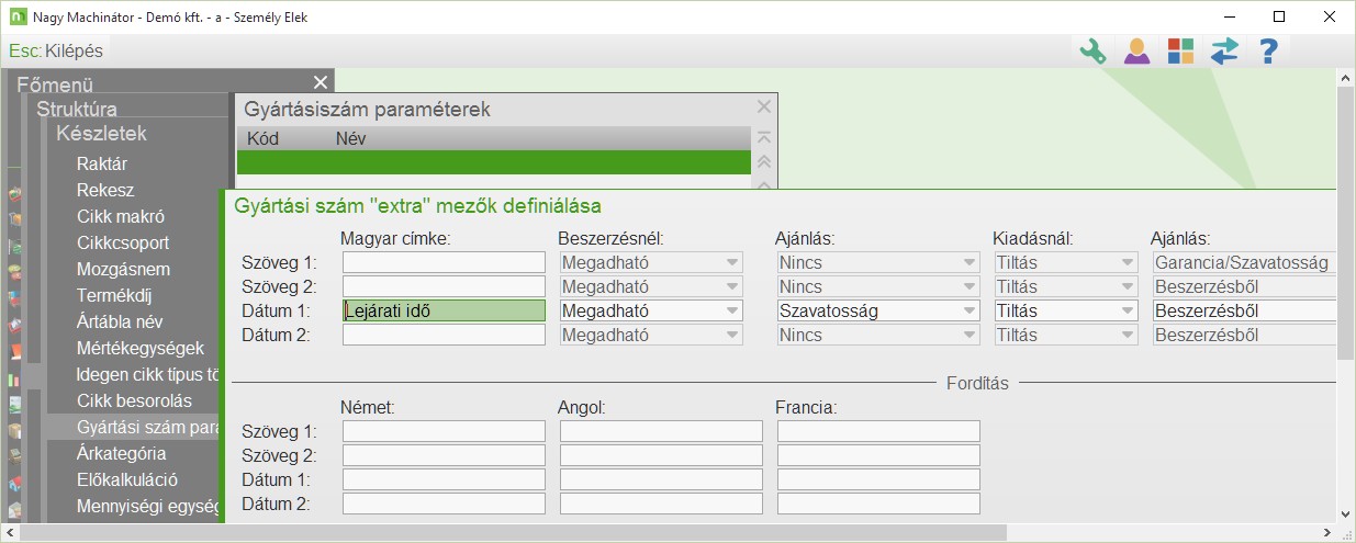 Amennyiben lejárati idővel rendelkező termékeket kell a komissió és fuvarszervezésnek kezelnie, a következőket kell figyelembe venni a struktúra adatok kialakítása során. CikktörzsA képen látható beállítással kell felvenni a cikket. Gyártási szám paraméterekA gyártási szám paraméterek funkcióban meg kell adni, hogy a Dátum 1 lejárati idő. Amennyiben nem minden terméket kell lejárati idővel ellátni, cikkbesorolás használatával lehet a gyártási számos cikkeket szétválasztani. Komissió paraméterekA képen látható helyen be lehet állítani, hogy ha az árut közvetlenül a raktárba szerzik be (vagyis az ügyfél szállítja az árut és nem saját szállítás), a program ajánlja meg a gyártási számot, hiszen lejárati idővel rendelkező cikkek esetében a gyártási számnak (vagy LOT számnak) általában nincs jelentősége és nem is tudják a felhasználók. Fuvar paraméterekA képen látható helyen be lehet állítani, hogy ha az árut saját magunk szállítjuk be a raktárra, a program ajánlja meg a gyártási számot, hiszen lejárati idővel rendelkező cikkek esetében a gyártási számnak (vagy LOT számnak) általában nincs jelentősége és nem is tudják a felhasználók. |