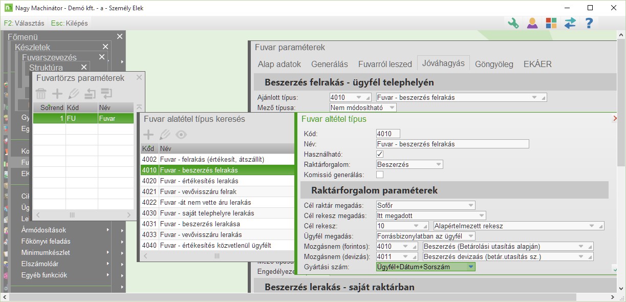 Kitárolási komissiótérA kitárolásoknál használt rekeszt érdemes az utolsó 99999999-es rekeszkódra felvenni. Erre azért van szükség, mert a kitárolás alatt lévő árut már nem akarjuk megmutatni a Áruforgalmi ügyintézőknek. Az Áruforgalom paraméterekben pedig a rekesztartomány megadásával ki lehet szűrni ezt a rekeszt. RaktárakA raktár alá fel kell venni azokat a tárhelyeket (rekeszeket), amelyeket tartalmaz a raktár. A bejárási sorrend megadásával lehet majd szabályozni, hogy a raktárban hogyan kell mozogni. Bértárolás esetén a bértárolásra használt tárhelyeket is fel kell venni. BértárolásBértárolás esetén ügyfelenként meg kell nyitni egy-egy logikai raktárt. Tárhelyet nem kell megadni, hiszen fizikailag a tárhelyes raktárban lesz áru. A bértárolás raktárt össze kell kapcsolni az ügyféltörzsbe felvett ügyfélhez. Sofőr raktáraA fuvarszervezés során az árut fizikailag fel fogja rakni a program a sofőr raktárára. Ezért minden sofőrnek létre kell hozni egy raktárt és össze kell kapcsolni a személytörzsbe is fel vett személyhez. Telephelyek / boltokA telephelyek / boltik igényét az ügyfélszolgálat a vevő ill. a szállítórendelések között tudja rögzíteni. Ezért a boltokat fel kell venni ügyfélként az ügyféltörzsbe. Majd minden boltnak nyitni kell egy raktárt és meg kell adni a boltnak felvett ügyfélkódot. A komissió és a fuvar miatt fontos, hogy mindkét helyen (ügyféltörzs, raktártörzs) ugyanaz a cím szerepeljen!