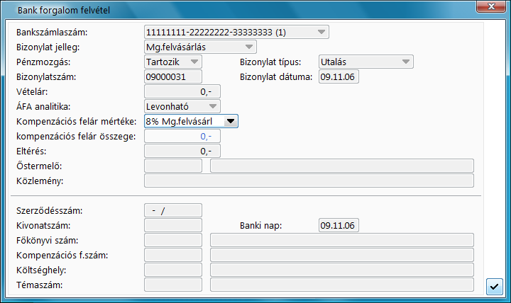 Bankban a kompenzációs felárhoz bizonylatot csak Tartozik típusú Pénzmozgás esetén lehet felvenni. A Bizonylat jellege Mg.Felvásárlás legyen és a Kompenzációs felár értékében ki kell választani az Áfa táblázatban megadott Áfakódot.