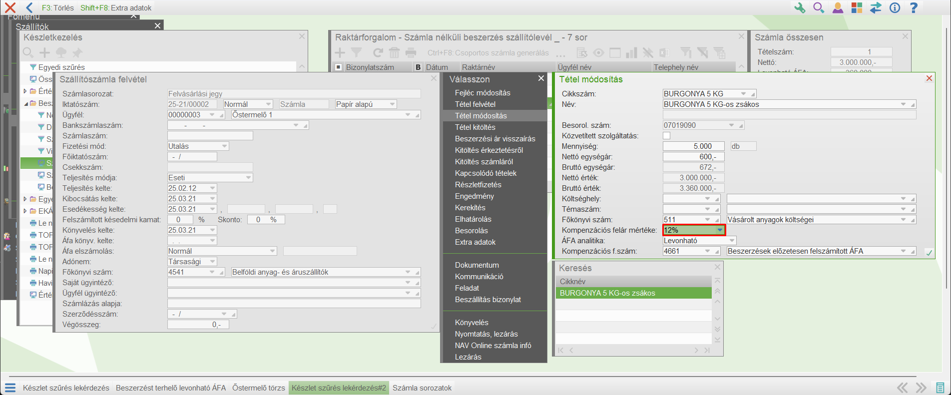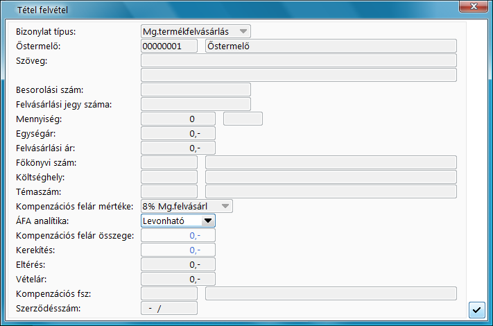 A program felvásárlási jegy készítésekor a kiválasztott termék áfa tartartalma helyett az Őstermelő törzsben megadott kompenzációs felár értékét fogja használni.