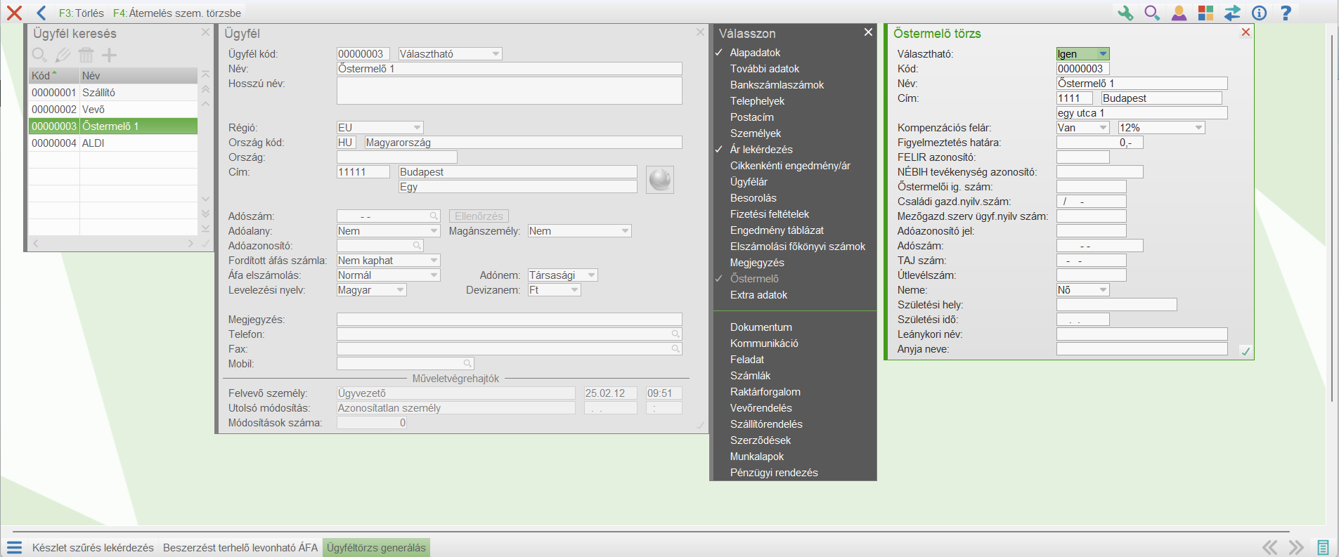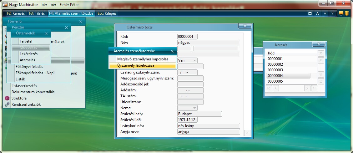 Ennek módja következő. A Pénztár / Őstermelő / Módosítás menüpontban a kiválasztott Őstermelő adataiban "F4-Átemelés szem.törzsbe" funkció billentyű megnyomása után megjelenik egy választási lehetőség. Művelet: Meglévő személyhez kapcsolás / Új személy létrehozása.
