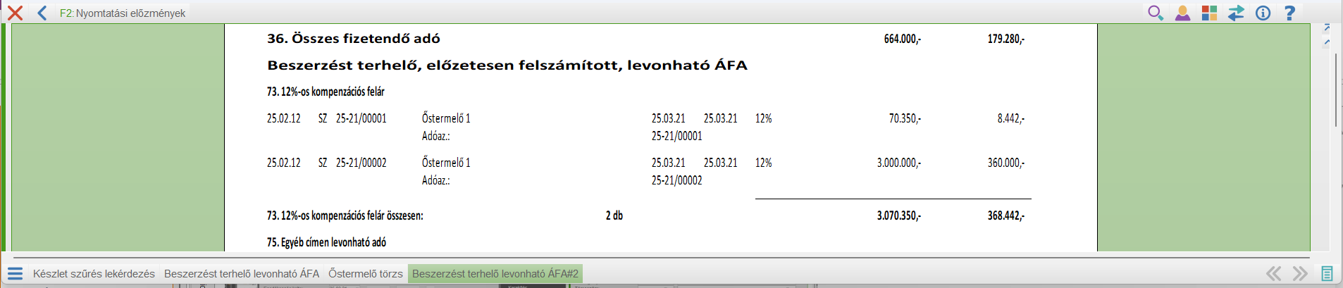 Ahhoz, hogy a havi bevallás a megfelelő sorokba hozza a pénztárba befizetett összegeket további feltétele, hogy a Bevallás paraméterekben az Őstermelőre vonatkozó sorokban (1320., 1340., 1350. sorokban) legyen megadva a Felvásárlási jegyben használt kompenzációs felár Áfakódja.