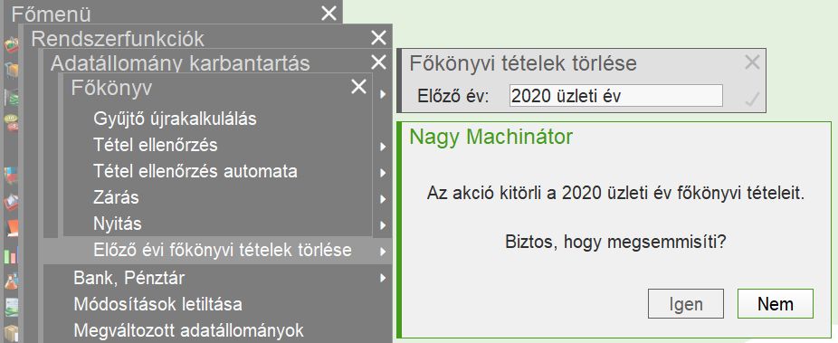 A Rendszerfunkciók/Adatállomány karbantartás/Főkönyv helyen törölhetők egy megadott pénzügyi év főkönyvi adatai. Megjegyzendő, hogy a korábbi törlésekkel ellentétben itt nem a megadott dátum előtti minden adat törlődik, csak egy konkrét pénzügyi év adata, ezért ha a funkciót nem minden évben indítjuk el, hanem néhány évente egyszer (vagy akár most először), minden törlendő évre külön-külön kell elindítani a funkciót.
