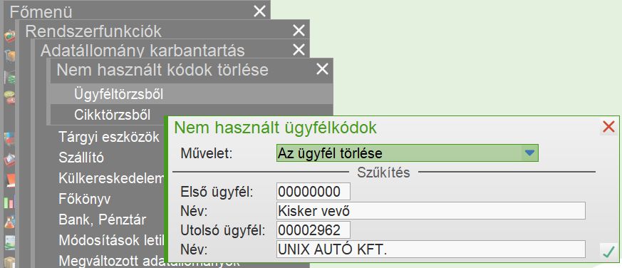 A forgalmi adatok törlése után (igény szerint) a Rendszerfunkciók/Adatállomány karbantartás/Nem használt kódok törlése helyen törölhetjük azokat az ügyfeleket, ill. cikkeket a rendszerünkből, melyekre nincs hivatkozás a forgalmi adatbázisokban.