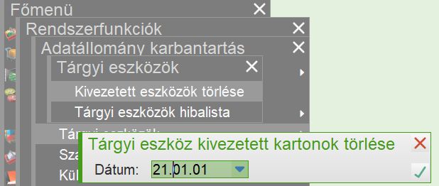 A Rendszerfunkciók/Adatállomány karbantartás/Tárgyi eszközök helyen törölhetjük azokat a tárgyi eszközöket, melyek ki lettek vezetve.