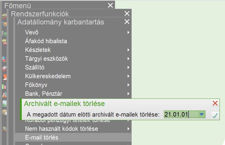 Lehetőségünk van az archivált emailek törlésére is a Rendszerfunkciók/Adatállomány karbantartás/Email törlés funkcióval.