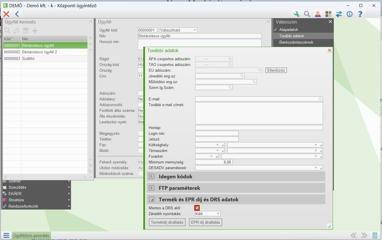 Amennyiben a Partnernek nem kell DRS-t számlázni, az ügyféltörzsben lehet jelölni, hogy mentes a DRS alól.