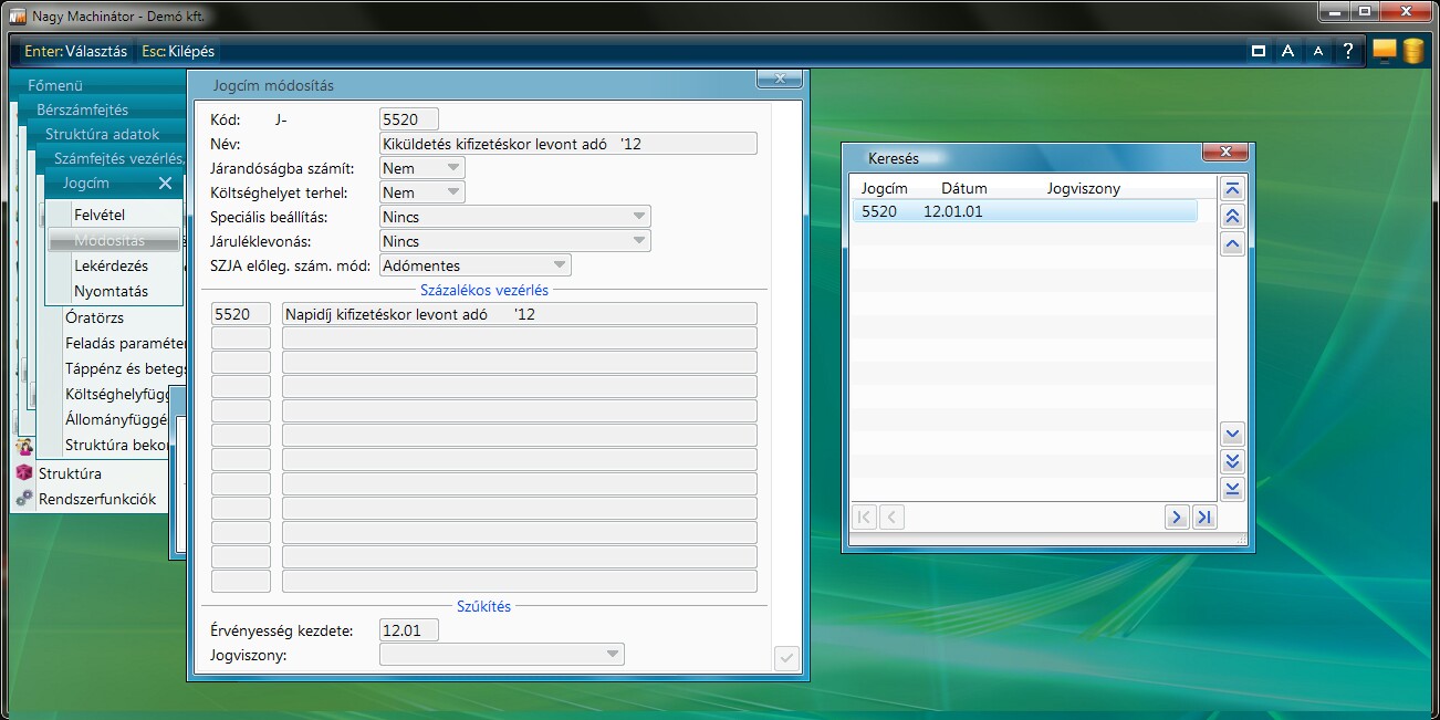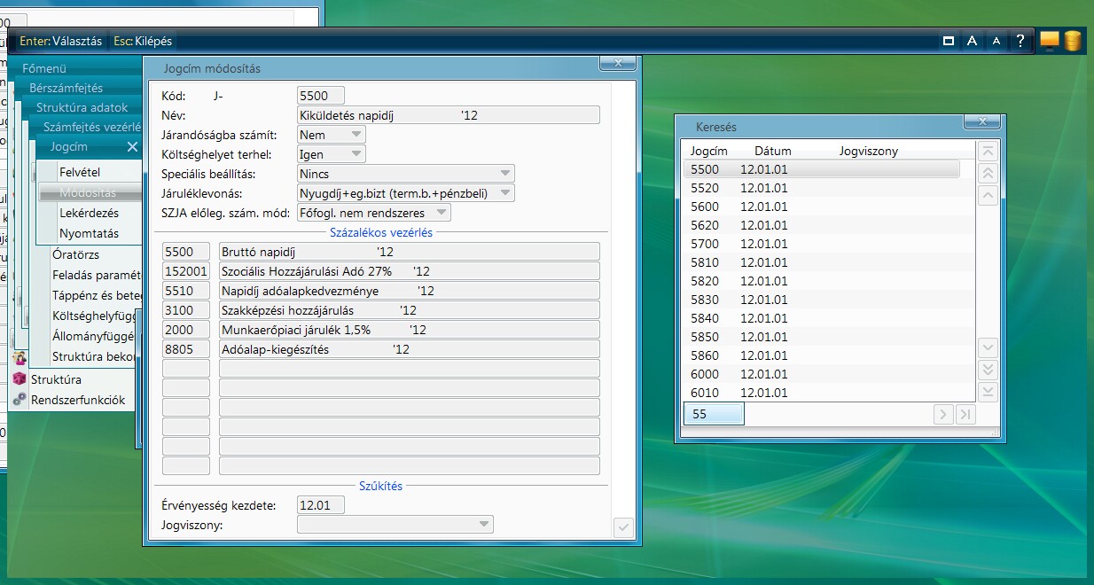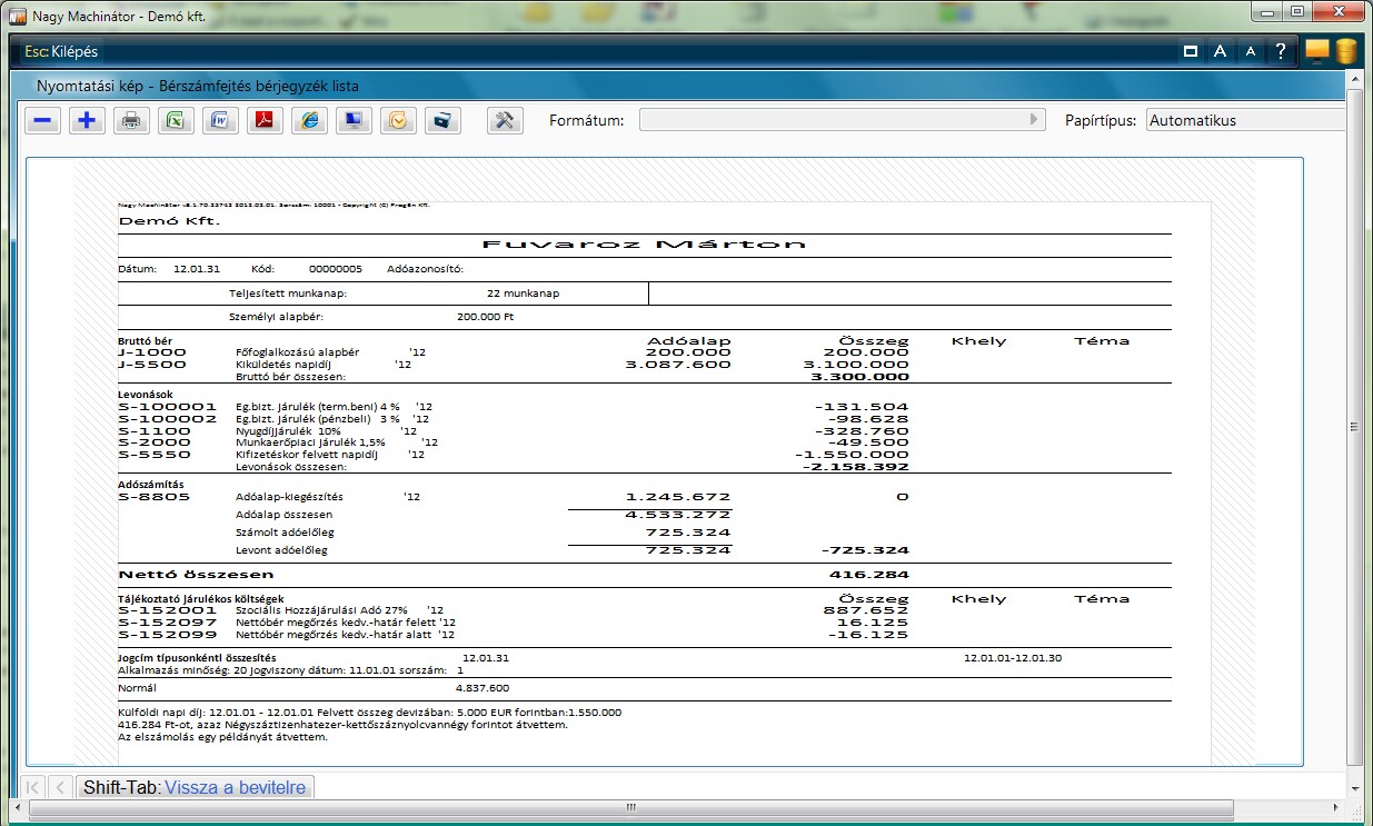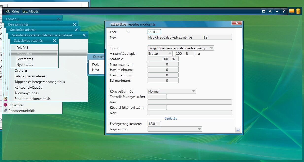 2012.01.01-től Számolt mező. A bruttó napidíj és az adóalapot nem képező rész különbsége. Az adatok rögzítése előtt az árfolyamokat (dollár, és a felvett napidíj árfolyama) érdemes rögzíteni, különben nem tud adóalapot számolni a program. Az adóalapot nem képező rész a bruttó napidíj 30%-a, de legfeljebb a számfejtés paraméterekben megadott napi adóalapot nem képező rész (Pl.: 15 EUR). Fizetéskor levont adó: Számolt mező. A Bruttó napidíj és a Felvett napidíj különbsége forintosítva. Az árufuvarozáshoz kapcsolódó napídíj 40 eurónak megfelelő forintösszegig adómentes marad. 1995/CXVII 3.melléklet II.7. 2010.01.01.-től Számolt mező. A bruttó napidíj és az adóalapot nem képező rész különbsége. Az adatok rögzítése előtt az árfolyamokat (dollár, és a felvett napidíj árfolyama) érdemes rögzíteni, különben nem tud adóalapot számolni a program. Teljes egészében adóköteles a külföldi, belföldi kiküldetés napidíja. 2009/LXXVII 186§ (17) és (19). Az árufuvarozáshoz kapcsolódó napidíj továbbra is 25 eurónak megfelelő forintösszegig adómentes marad. 1995/CXVII 3.melléklet II.7. Normál esetben az adóalapot nem képező rész 0 , míg fuvarozó esetén a számfejtés paraméterekben a fuvarozóhoz tartozó napi adóalapot nem képező rész (Pl.: 25 EUR). 2009.12.31.-ig Számolt mező. A bruttó napidíj és az adóalapot nem képező rész különbsége. Az adatok rögzítése előtt az árfolyamokat (dollár, és a felvett napidíj árfolyama) érdemes rögzíteni, különben nem tud adóalapot számolni a program. Az adóalapot nem képező rész a bruttó napidíj 30%-a, de legfeljebb a számfejtés paraméterekben megadott napi adóalapot nem képező rész (Pl.: 15 EUR). Fizetéskor levont adó: Számolt mező. A Bruttó napidíj és a Felvett napidíj különbsége forintosítva. 2023.03.30-tól Az árufuvarozáshoz kapcsolódó napídíj 85 eurónak megfelelő forintösszegig adómentes marad. |