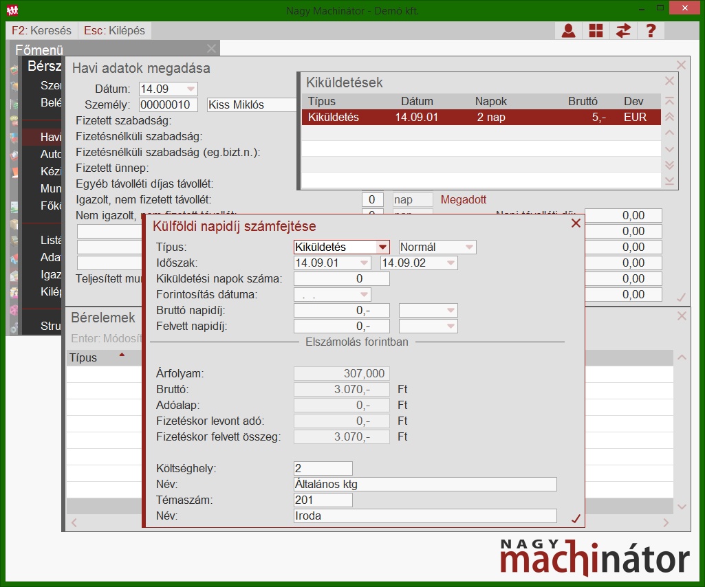 Külföldi kiküldetés napidíj számfejtése a havi adatok bevitele akcióban.