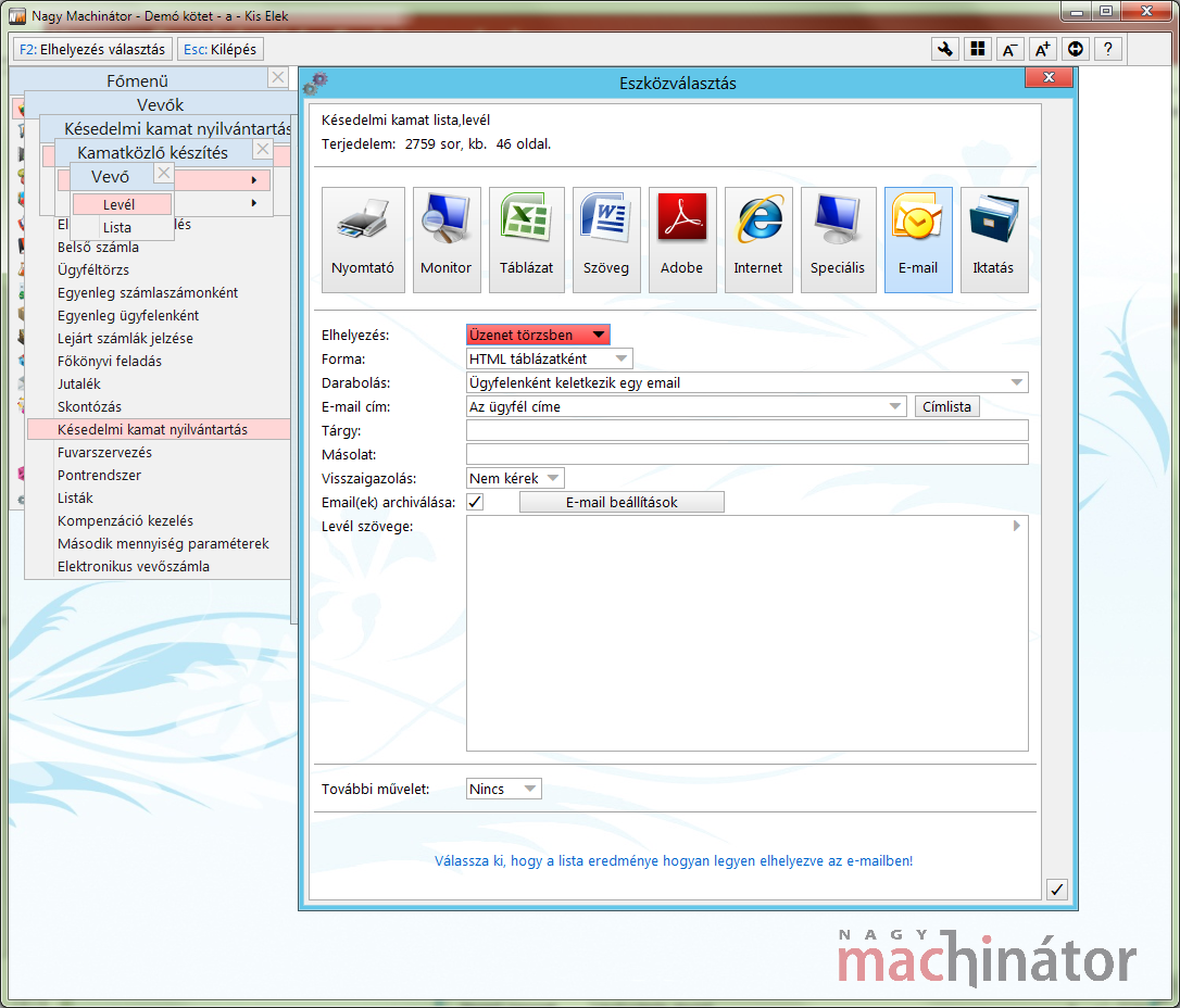 Ebben az esetben a legösszetettebb az ablak felépítése. Dönteni kell, hogy az elküldendő emailben melléklet vagy üzenet szöveg legyen-e a listánk. Ettől függően kérdés a lista formátuma. Valószínűleg a leggyakrabban használatos email küldés az lesz, ha a lista az üzenet törzsben van HTML formátumban. A program segítséget nyújt az email címek megadásához. Amennyiben az ügyféltörzsben vagy az ügyfél személyei között az email címek ki vannak töltve a program automatikusan onnan veszi a címet. Csak meg kell adni, hogy melyik ügyfélnek készüljön a levél. Ha nincs konkrét ügyfél, akkor egy ügyfélbesorolás csoportba tartozó ügyfeleknek