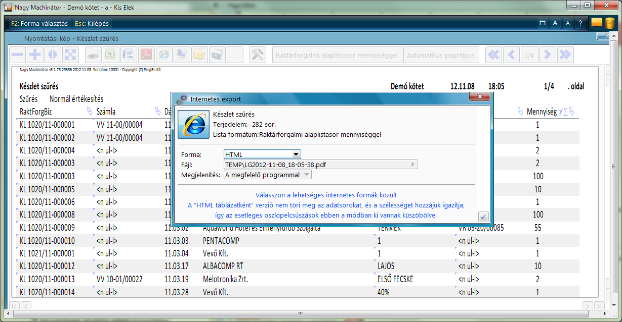 Internetes Az alforma által meghatározott interneten használt file formában készül az export. Egy file-név megadása kötelező, illetve ha üresen hagyjuk, a program automatikusan generál egyet a dátum és idő felhasználásával Kapcsolódó paraméter: PrnEszköz |