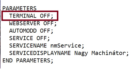 1. A program könyvtárában található MAIN.CFG fájlban át kell írni a PARAMETERS blokkban található TERMINAL ON kapcsolót TERMINAL OFF-ra.