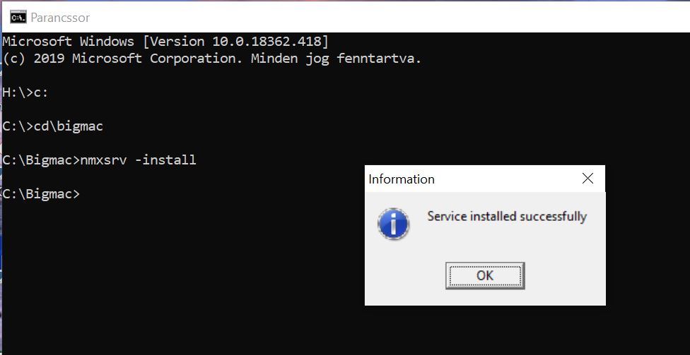 "NMXSRV -install" parancsot. Amennyiben sikeres a telepítés, a Windows tájékoztat erről. A program így bekerül a Windows háttérszolgáltatásai közé automatikus indítási móddal (a Windows indulásával a szolgáltatás is elindul automatikusan).
