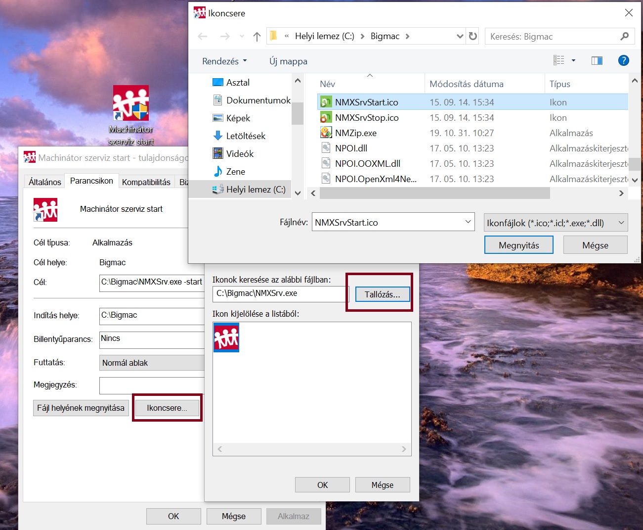 Az elsőnél adjuk meg pl. a "Machinátor szerviz start", míg a másodiknál a "Machinátor szerviz stop" nevet. A létrejött ikon tulajdonságaiban változtassuk meg a parancs ikonképét.
