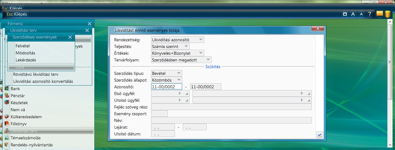 A Likviditás modulba rögzíthető szerződések listázására szolgáló funkció. A lista alkalmas a szerződésekkel összekapcsolt számlák listázására is. Ezzel válik lehetővé az egyes szerződések egyenlegének meghatározására.