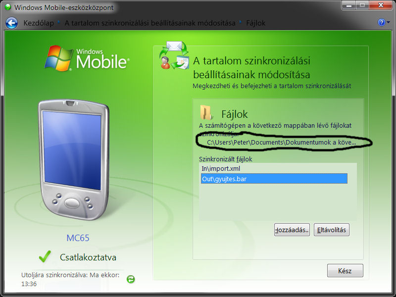 Arra van lehetőség, hogy az eszközön a "My Device\My Documents" mappába létrehozzunk új almappákat, és azok tartalma is bekerül az automatikus szinkronizálásba (csak ezt a mapparendszert szinkronizálja az eszköz!):