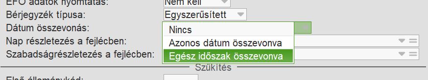 Amennyiben a váltás hónap közben történik, természetes igény lehet, hogy a havi számfejtés egy lapon jelenjen meg. Ez alaphelyzetben nem így történik, mivel a programban SID-enként külön kell számfejteni, így pl. ha a váltás hónap 15.-én volt, akkor számfejteni kell a korábbi jogviszonyt tartalmazó SID-ben hónap 15.-én, majd az új jogviszonyt tartalmazó SID-ben hónap végén. Ekkor a bérjegyzés alapértelmezés szerint az adott hónapra két lapon mutatná meg a számfejtett értékeket. A Bérjegyzék lista beviteli ablakában azonban van egy kapcsoló, mellyel elérhetjük, hogy az egy listázott időszakban (tipikusan egy hónap) történt számfejtéseket egy lapon összevonva jelenítse meg az utolsó számfejtés dátumával.