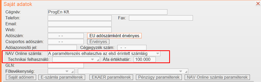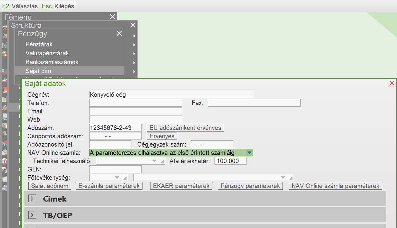 A beállításokat a Struktúra / Pénzügy / Saját adat menüpontban kell végrehajtani.