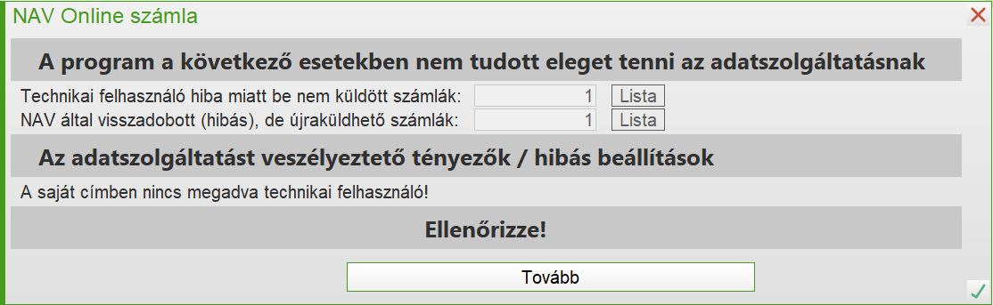 Megjegyzendő, hogy a rendelet szerint csak akkor tekinthető az adatszolgáltatás teljesítettnek a program üzemeltetője szempontjából, ha a NAV-tól elfogadó üzenet érkezett vissza a beküldött számlára. Hiba esetén a NAV nem fogadta be a számlát, így annak adatszolgáltatása nincs teljesítve. Amennyiben az adott kötetben valamilyen hiba van a beküldendő/beküldött számlákkal kapcsolatban, a kötetbe belépéskor a program egy tájékoztató ablakot mutat, melyben látható, mennyi és milyen hibás számlák vannak az adatbázisban.