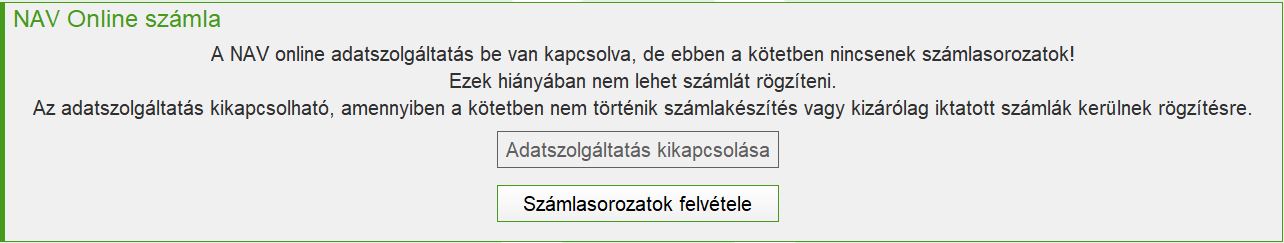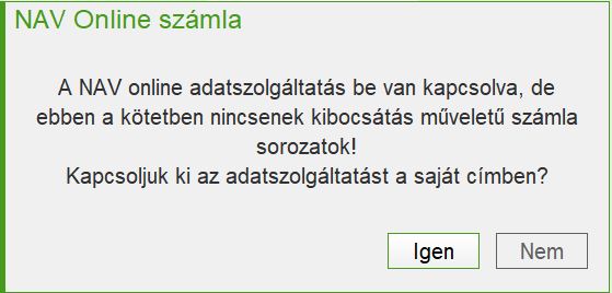 1. Amennyiben a kötetben már vannak számlasorozatok és azok között van kibocsátás típusú is, a NAV Online adatszolgáltatás kikapcsolása nem lehetséges. Meghagyható azonban (pl. technikai felhasználó hiányában) az elhalasztás, ekkor lehet nyomtatni, de az első érintett számla nyomtatásánál automatikusan bekapcsolódik az adatszolgáltatás, természetesen maga az adatküldés nem tud megvalósulni technikai felhasználó hiányában, ezt pótolni kell 48 órán beül.