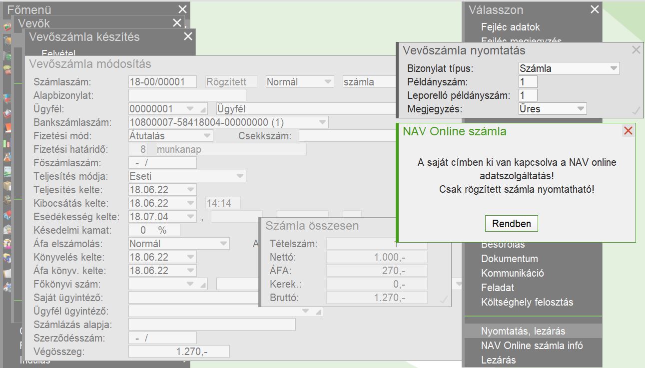 - Előlegszámla nyomtatásánál az előlegszámla kibocsátás és esedékesség kelte a rendszerdátum lesz a korábbi működés helyett, mely szerint a banktétel könyvelési dátuma volt.