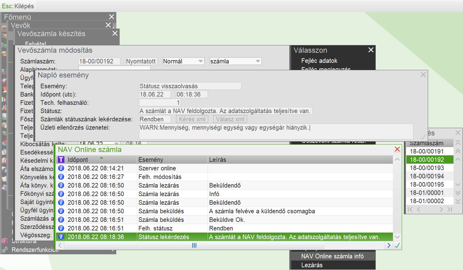 Azokról a számlákról, melyek sikeresen be lettek küldve és a NAV hiba nélkül vissza is igazolta, a Machinátor nem készít listán, azonban egy-egy konkrét számláról a számla módosításában/lekérdezésében kapunk információt a NAV Online Számla info almenüben.