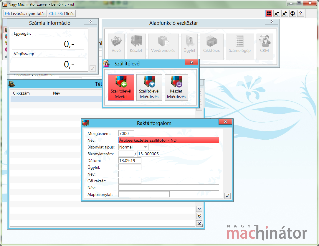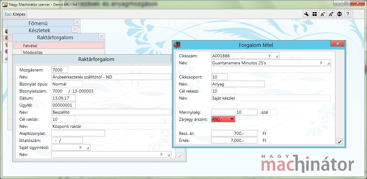 Az anyagmozgásokat a Készletek / Raktárforgalom / Felvétel menüpontban lehet végrehajtani.
