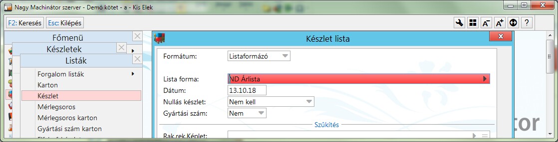 Árlistát a készletlistából lehet nyomtatni árszintenként. Ehhez a képen látható listaformát kell választani.